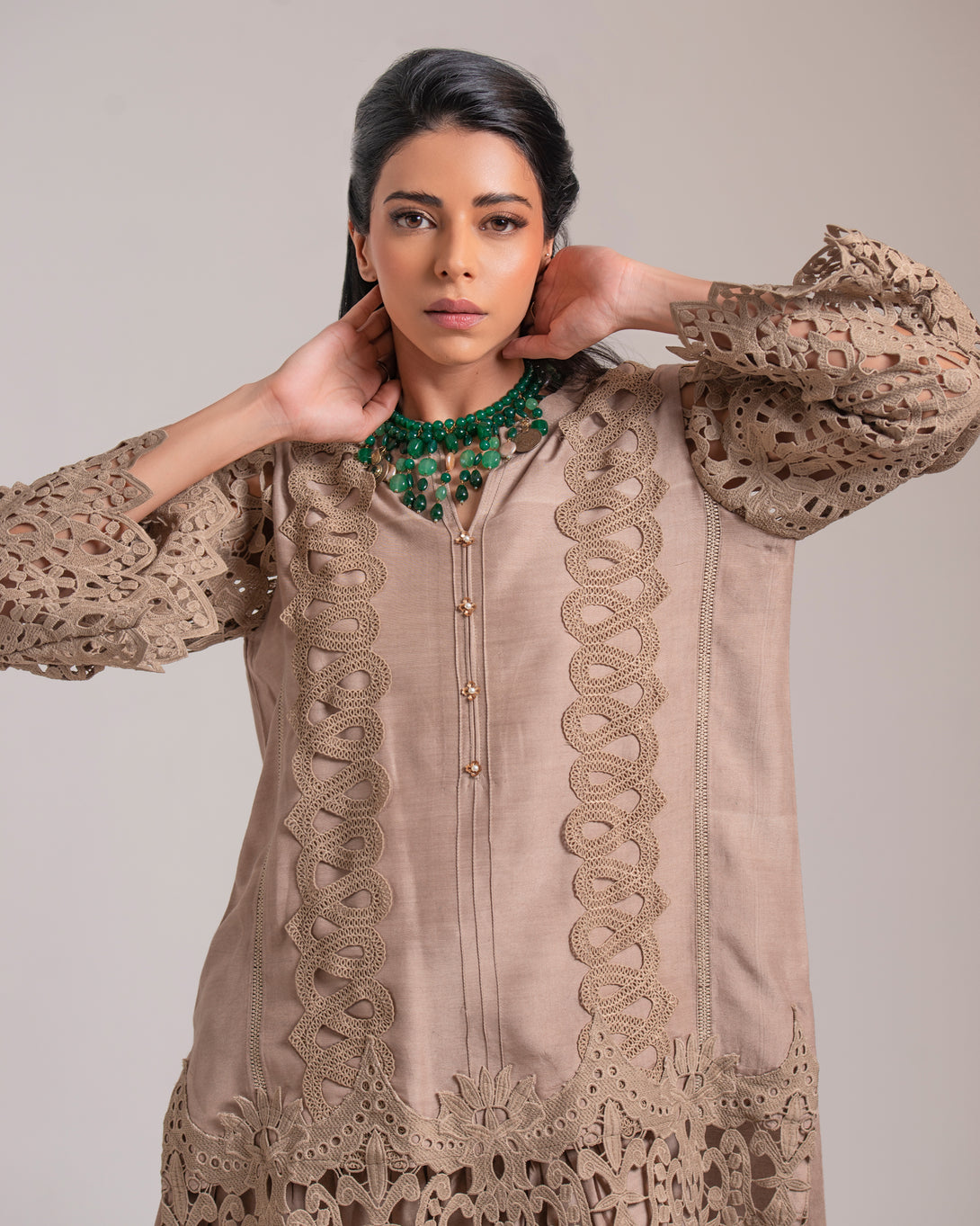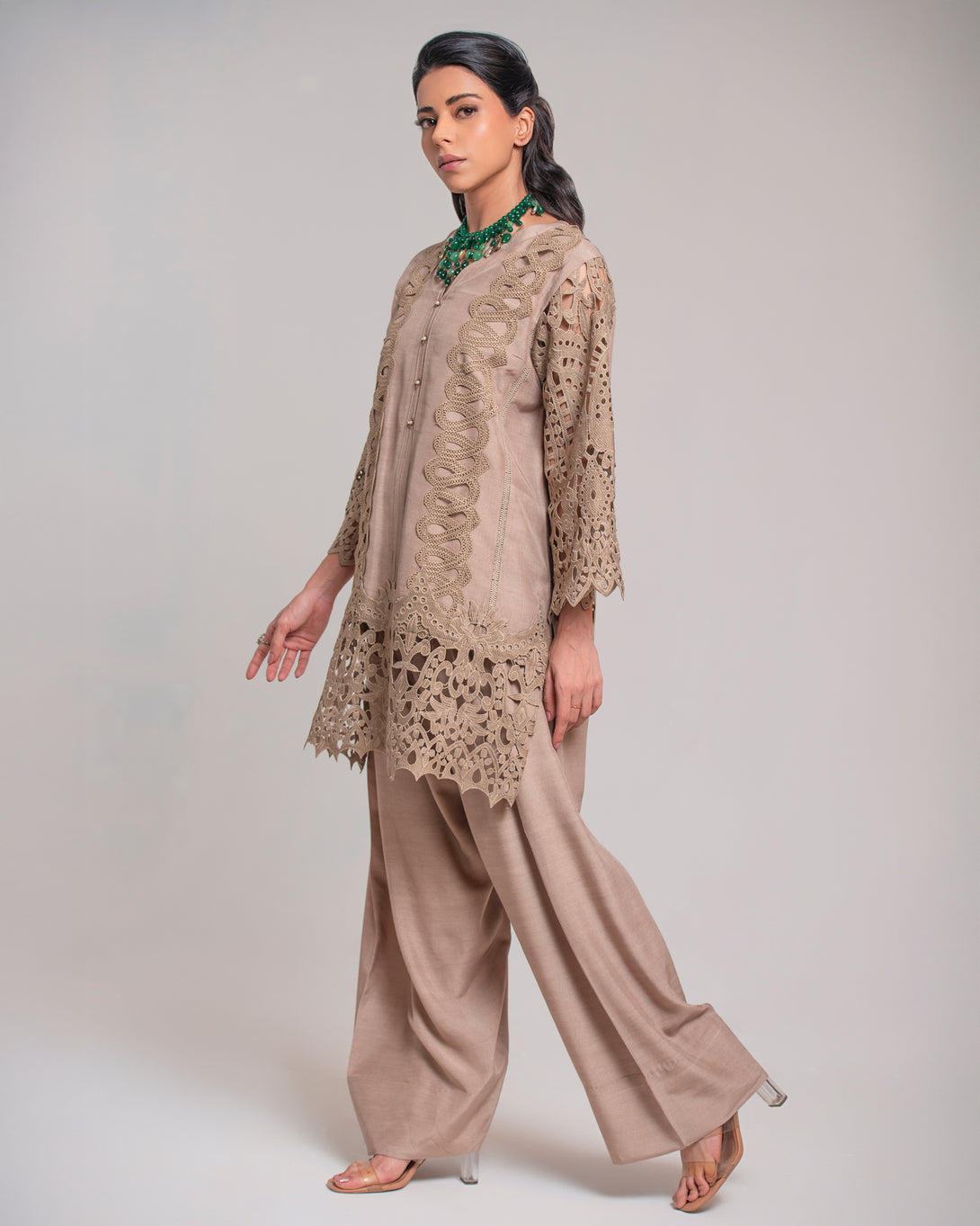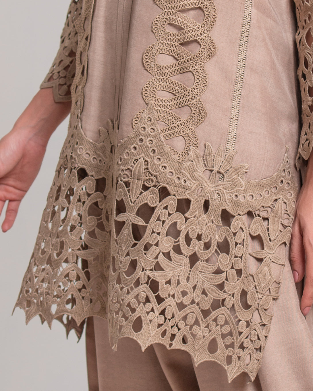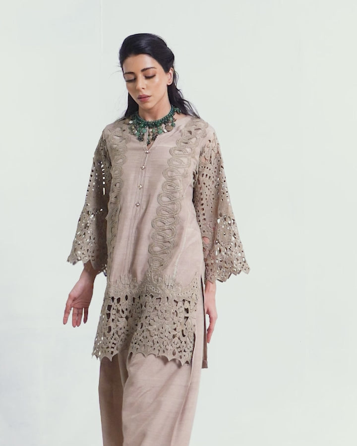 The shirt is adorned with intricate cutwork lace detailing along the sleeves and hem, creating a captivating visual texture. The sophisticated beige hue makes this raw silk suit a versatile choice for a variety of occasions.