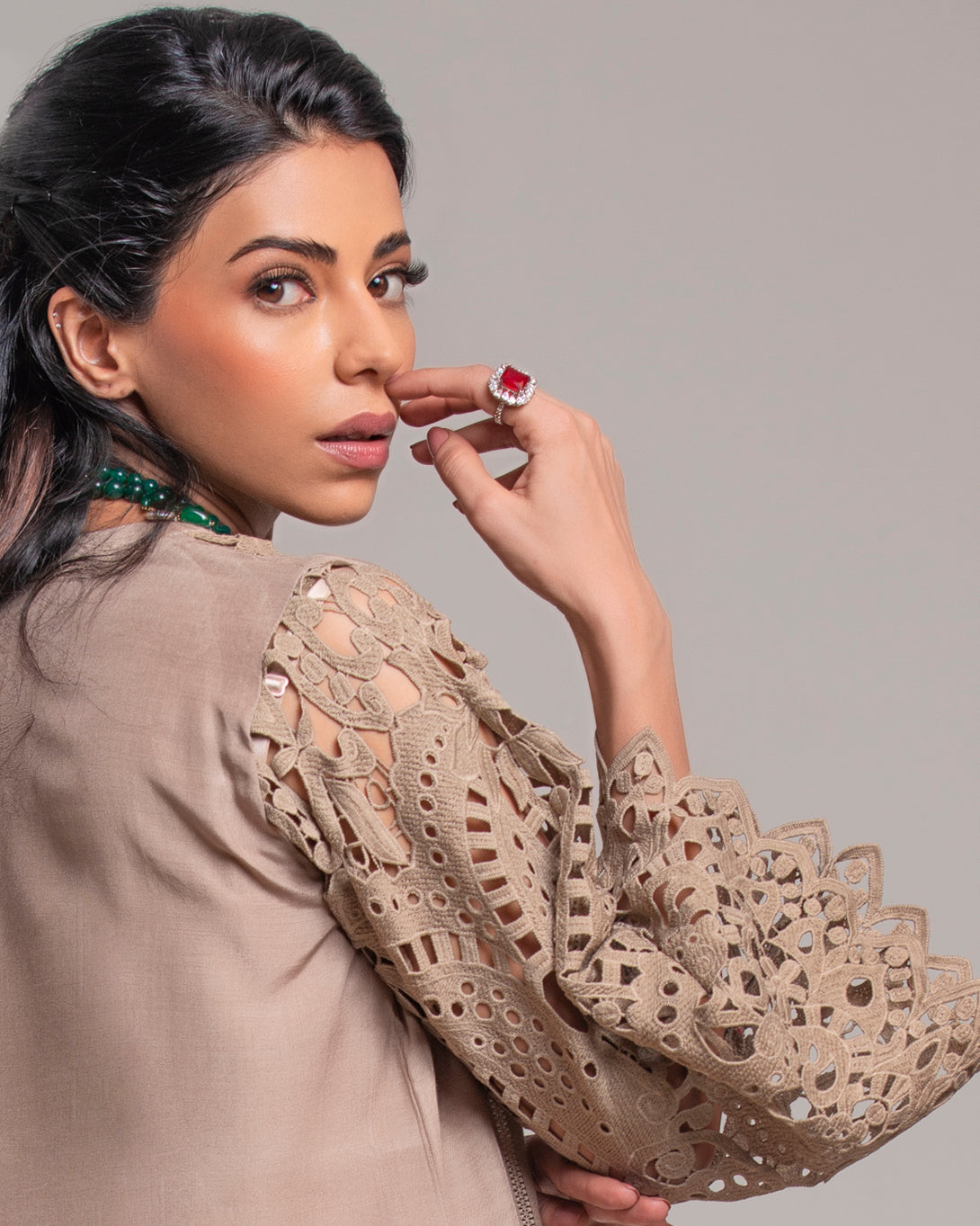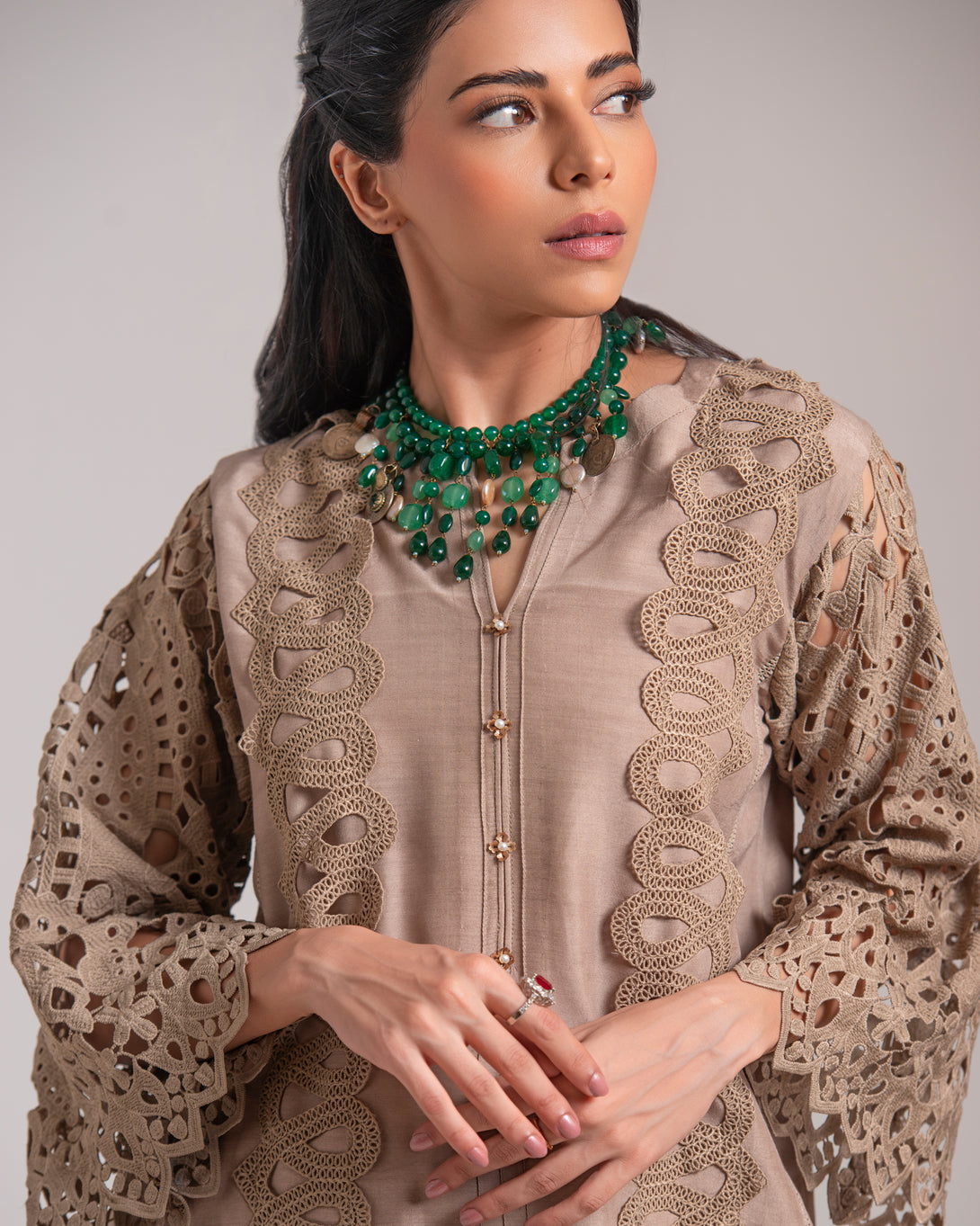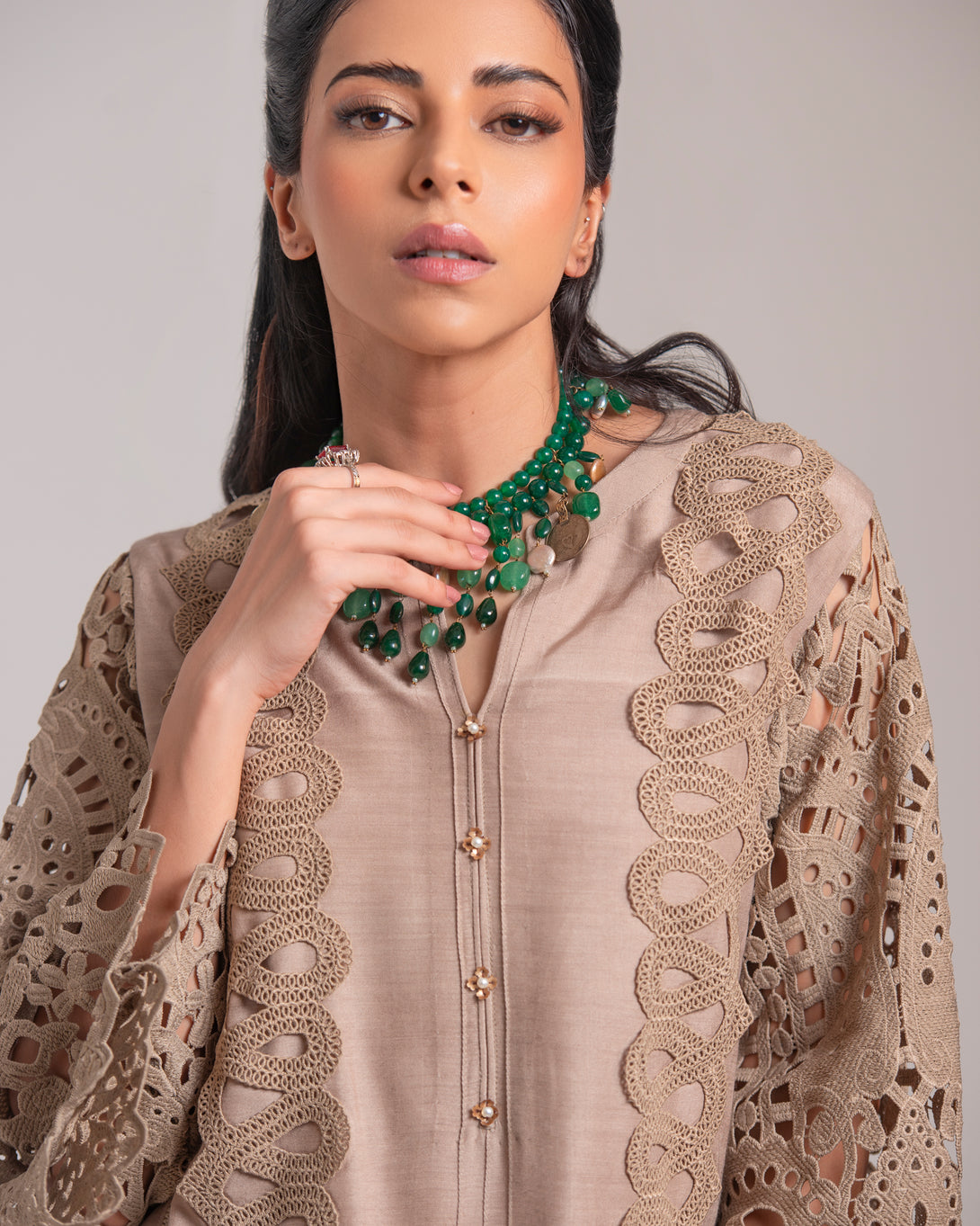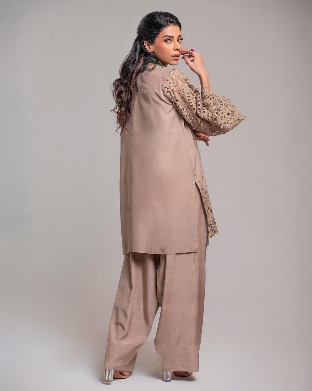 The shirt is adorned with intricate cutwork lace detailing along the sleeves and hem, creating a captivating visual texture. The sophisticated beige hue makes this raw silk suit a versatile choice for a variety of occasions.