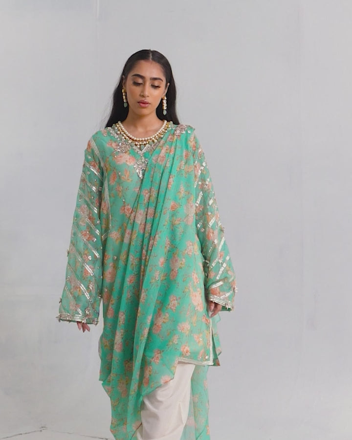 This set includes a printed cotton net shirt and dupatta, beautifully embellished with gota handwork, sequins, dapka, and delicate pearls. Paired with a comfortable Korean raw silk shalwar.