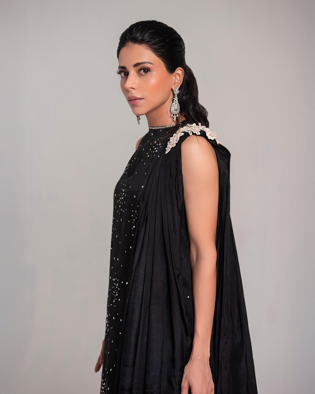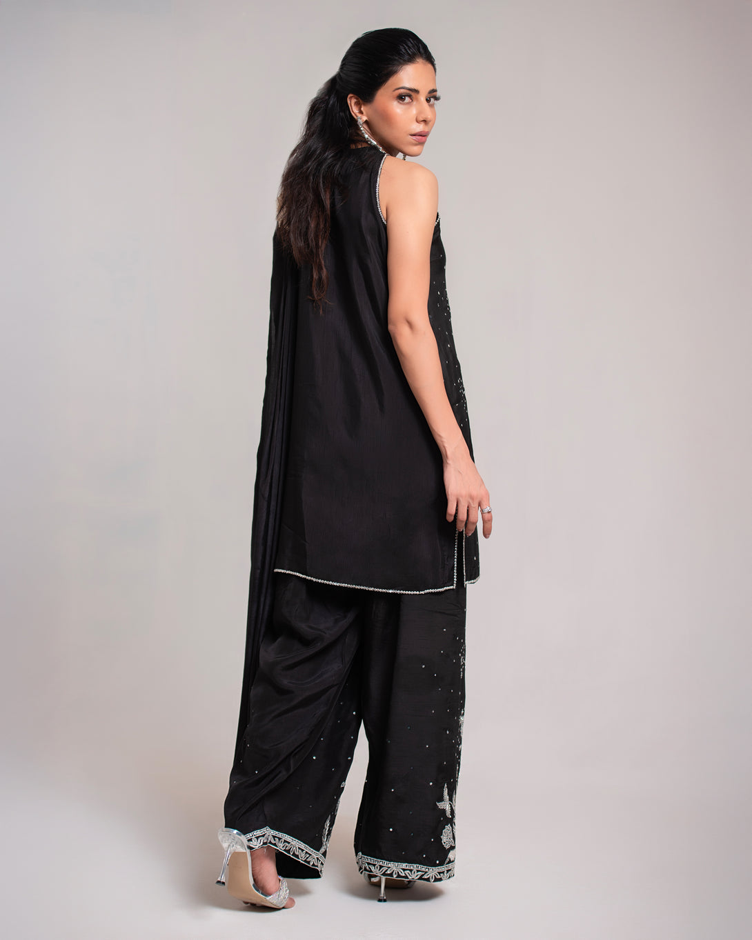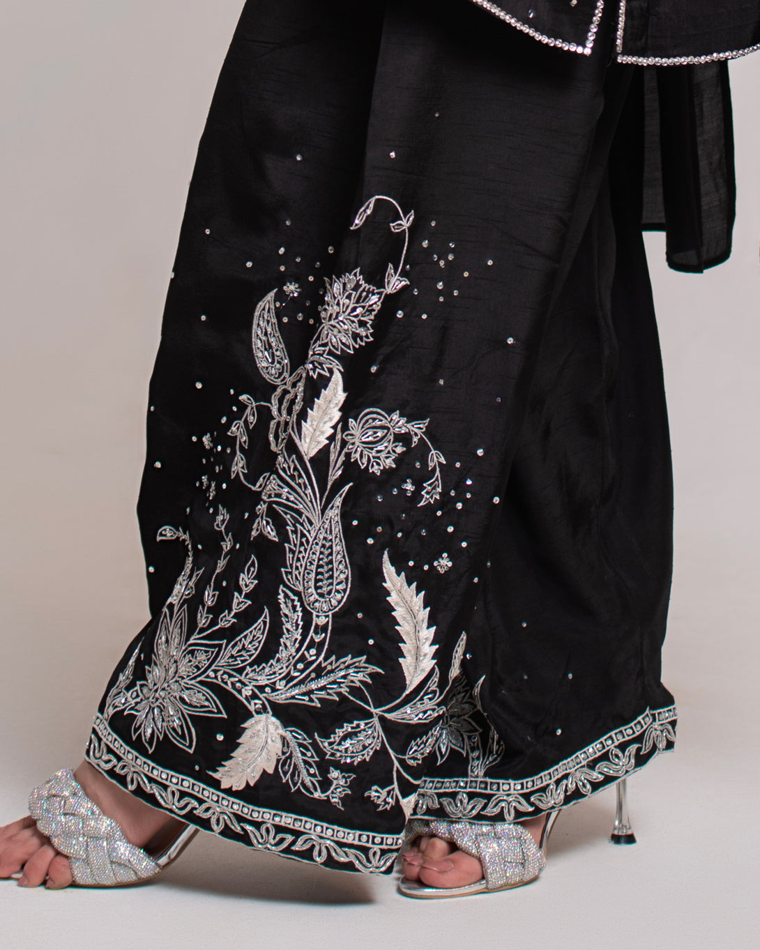 The deep black raw silk serves as the perfect canvas for exquisite off-white and silver hand embroidery. Intricate Resham work, shimmering sequins, and brilliant silver stones stand out vividly, creating a striking contrast that makes this a true statement piece. The delicate yet impactful embroidery on the pants adds an extra touch of elegance.