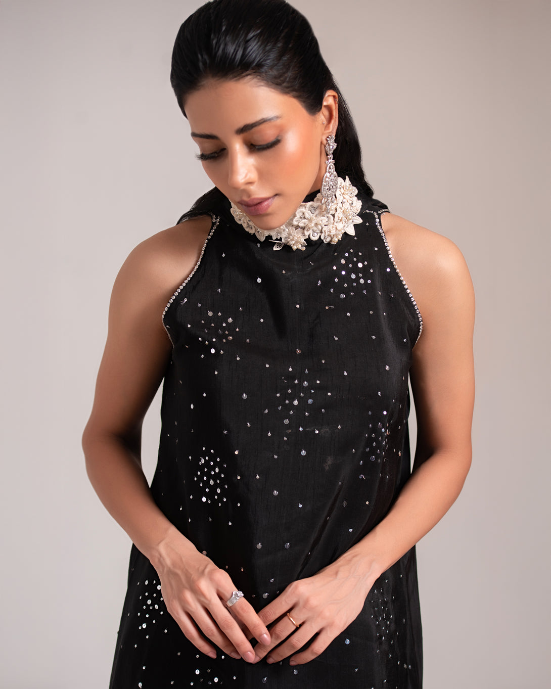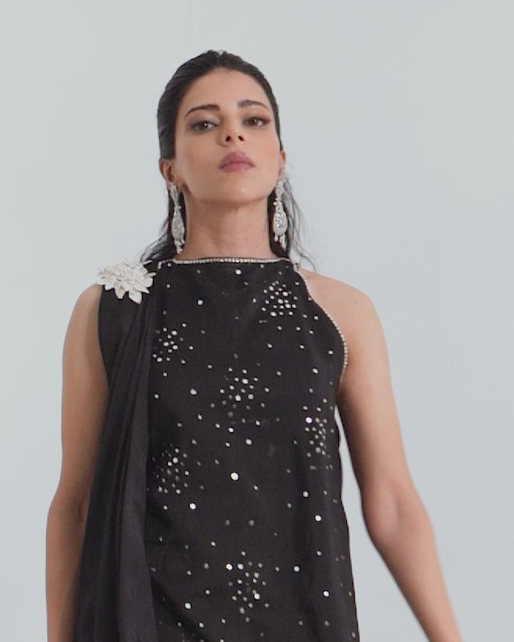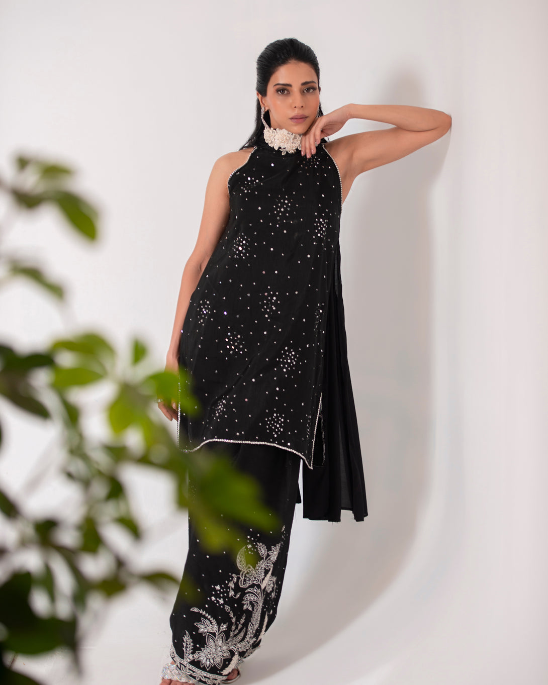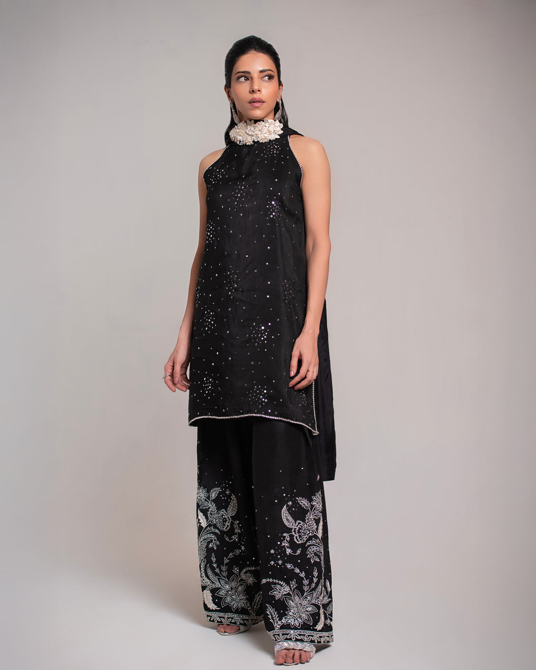 The deep black raw silk serves as the perfect canvas for exquisite off-white and silver hand embroidery. Intricate Resham work, shimmering sequins, and brilliant silver stones stand out vividly, creating a striking contrast that makes this a true statement piece. The delicate yet impactful embroidery on the pants adds an extra touch of elegance.