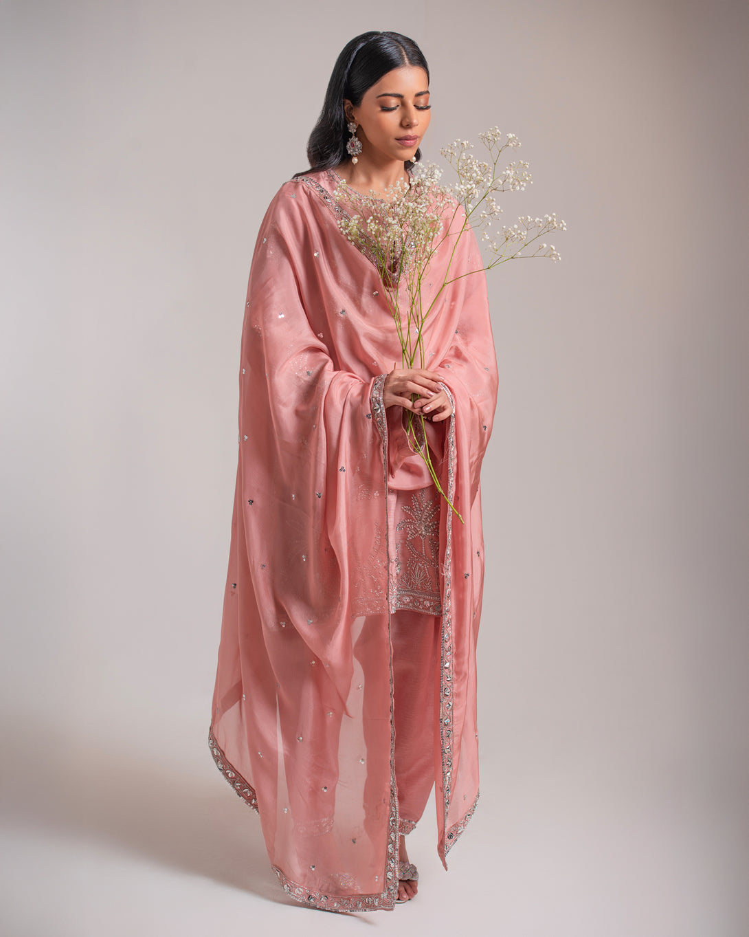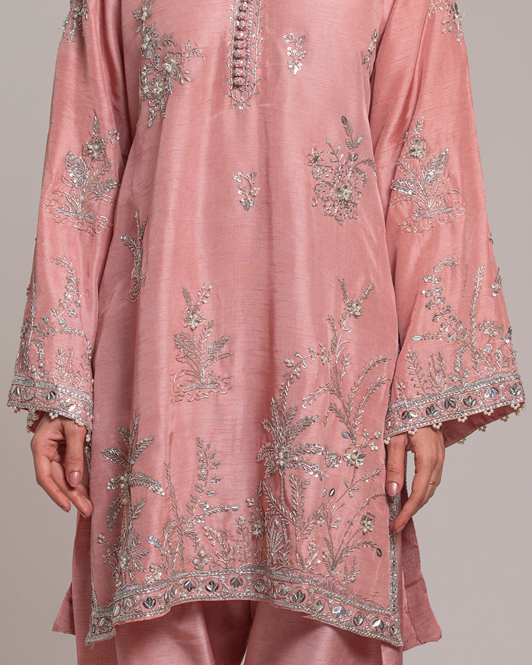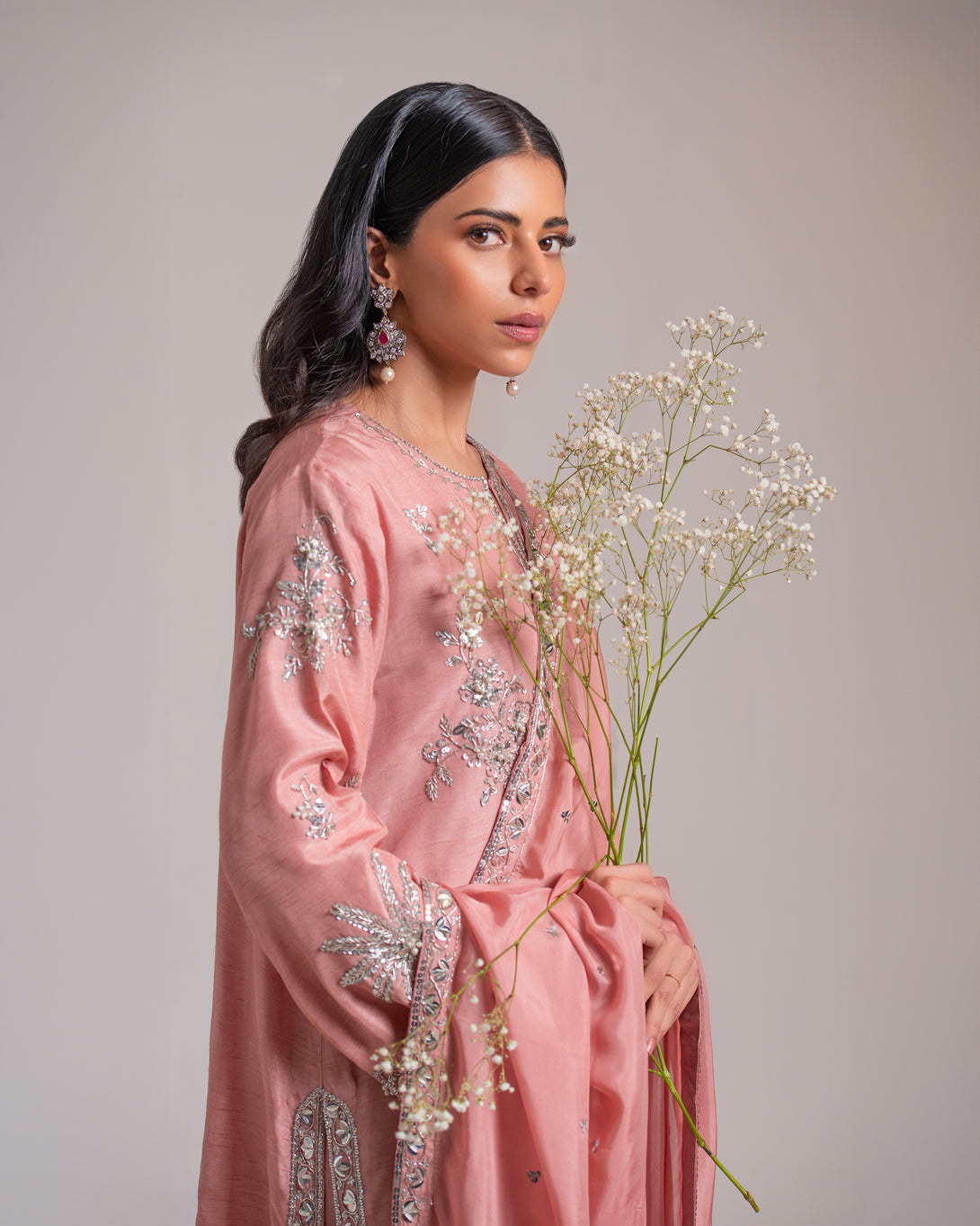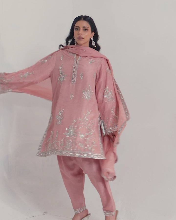 The Kashmiri Pink raw silk is exquisitely adorned with intricate silver hand embroidery. Meticulous sequin work, delicate cut dana, and shimmering silver zari create dazzling patterns that ensure a perfect look for any celebration. A subtle touch of gota work adds traditional flair.