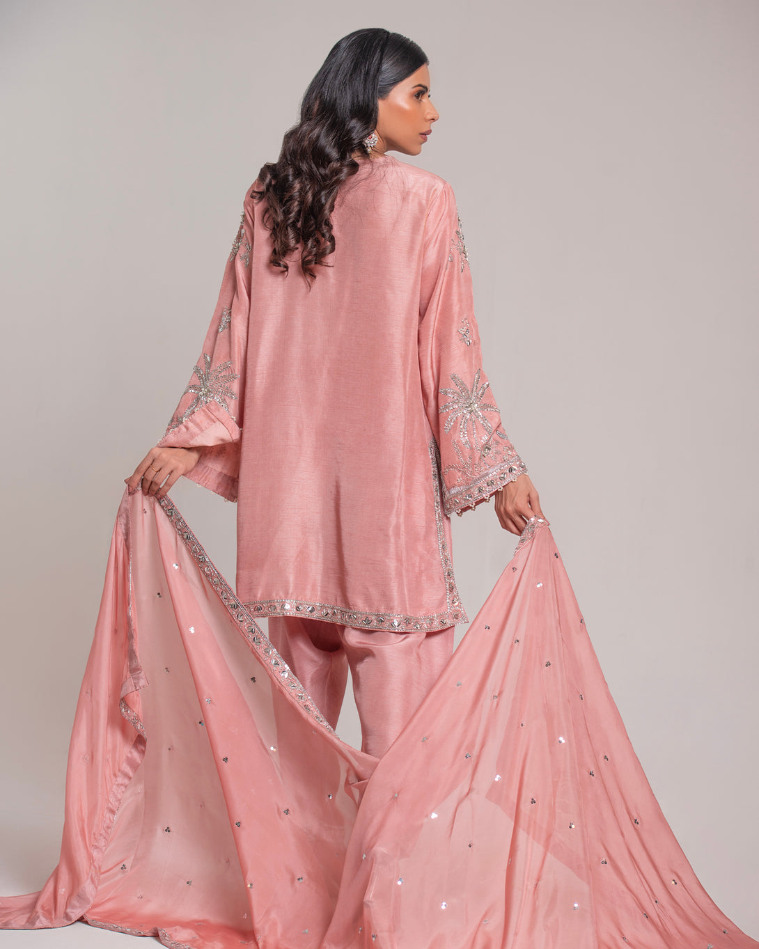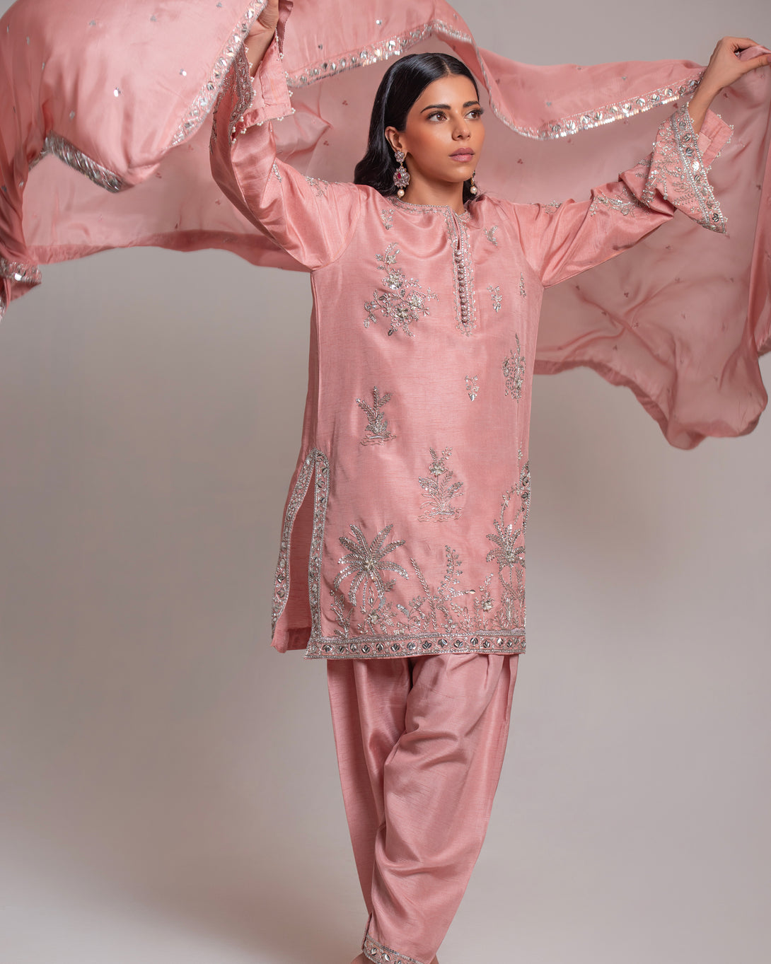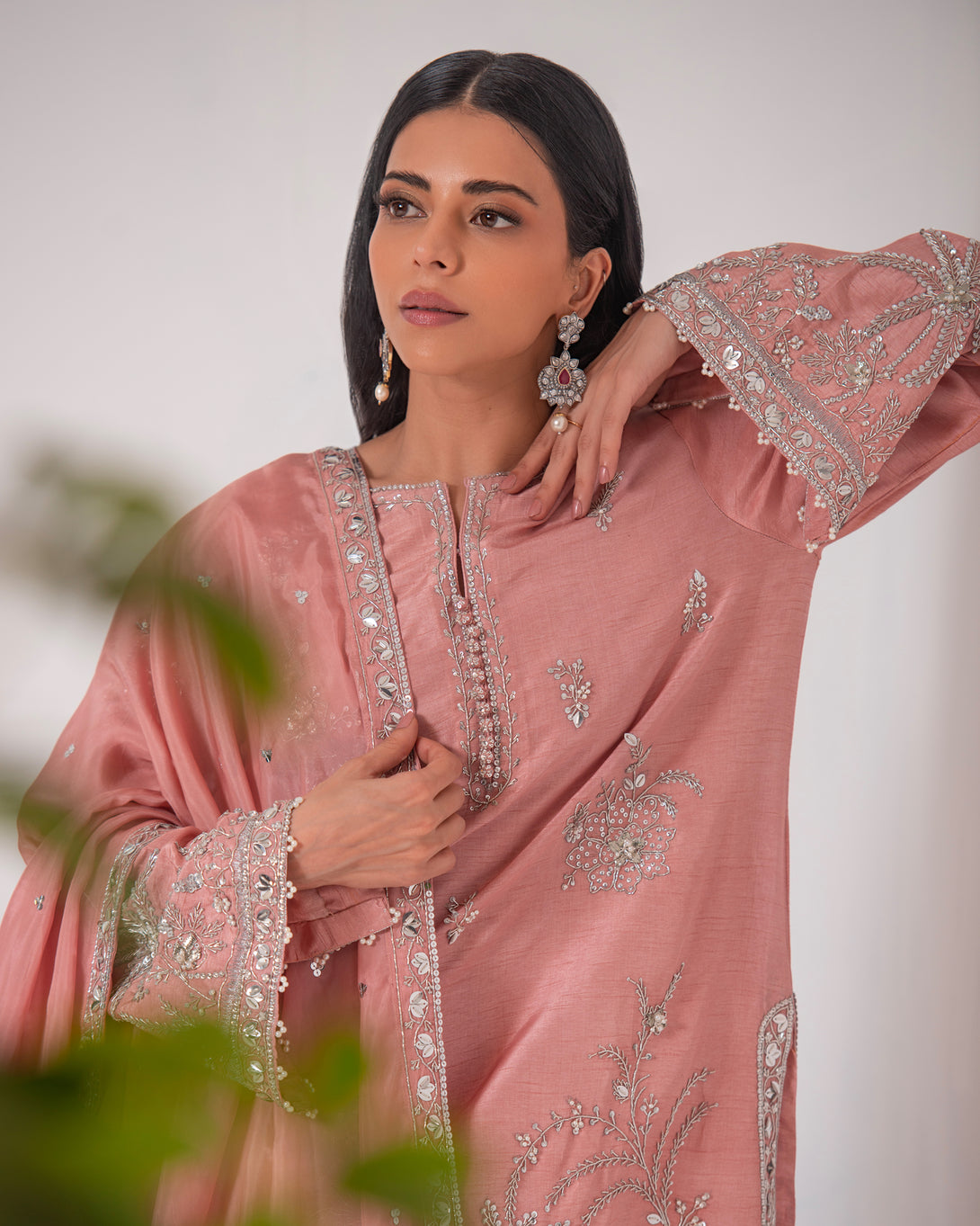Embrace festive elegance with our Camelia 3-Piece Suit, designed to captivate with its charming Kashmiri Pink hue. This beautiful ensemble includes a short shirt and stylish shalwar, both crafted from luxurious Korean raw silk, complemented by a graceful medium silk dupatta.