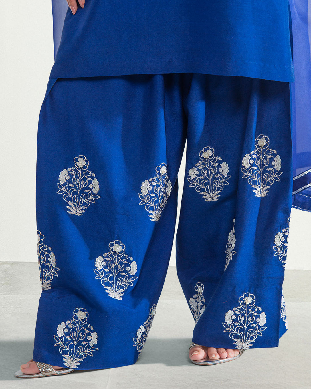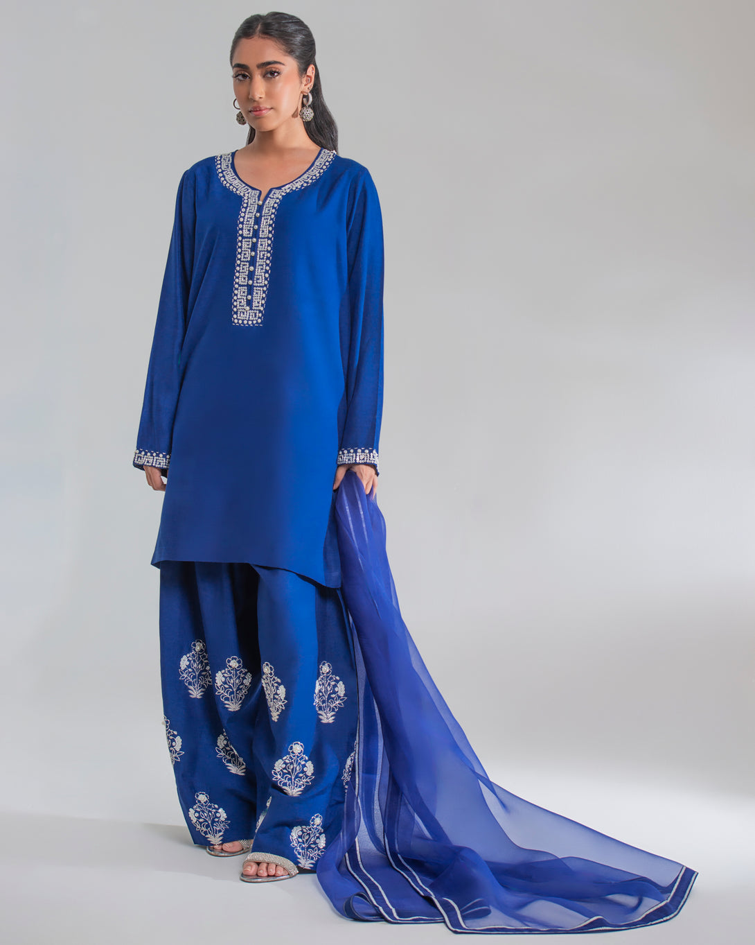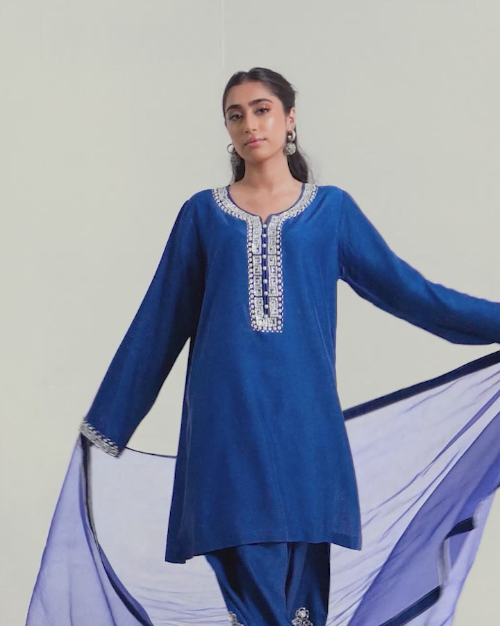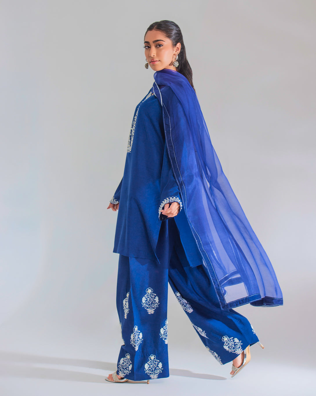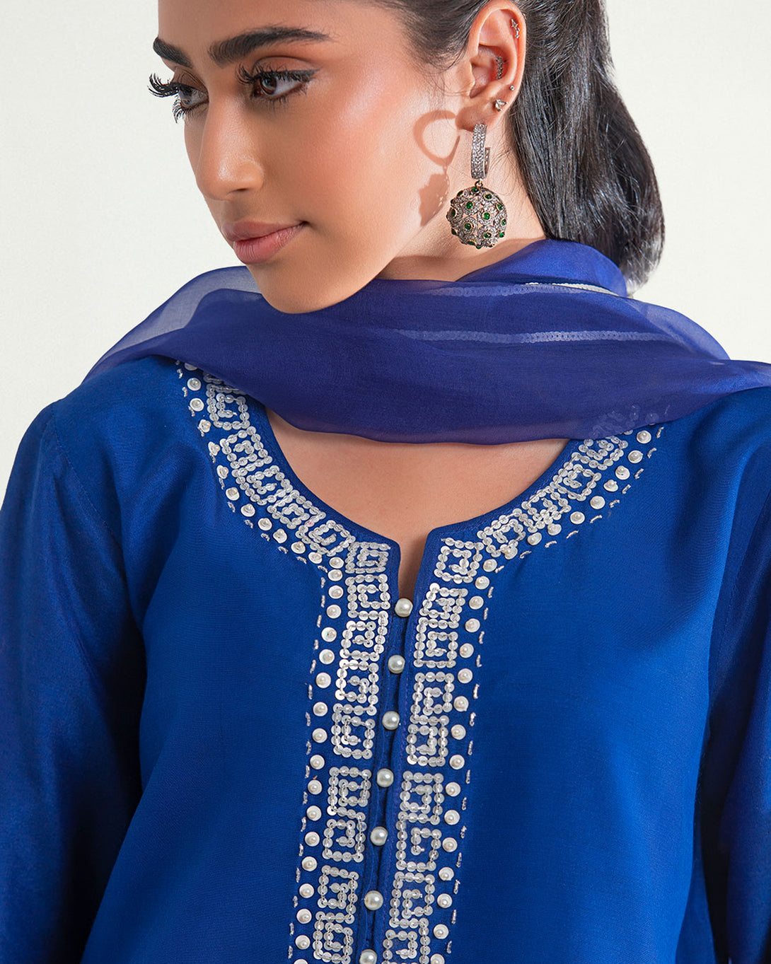 The deep Cobalt Blue of the Korean Raw Silk shirt and pants serves as a perfect canvas for the intricate hand embroidery. Shimmering sequins and delicate cutdana create captivating patterns on both the shirt's neckline and the pant's hem, adding a luxurious touch. The accompanying organza dupatta drapes beautifully, completing this sophisticated look.