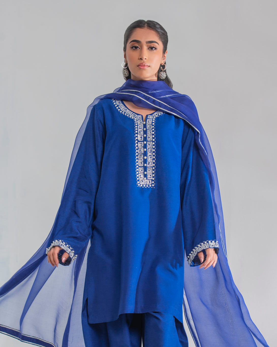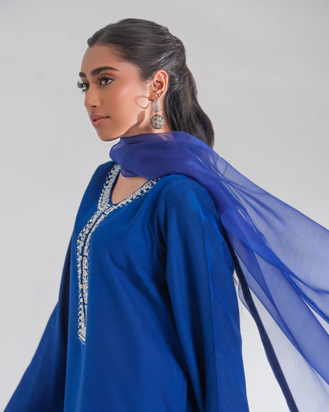 Make a vibrant statement with our Cobalt Blue 3-Piece Suit, designed to captivate with its rich hue and exquisite craftsmanship. This stunning ensemble includes an embroidered shirt, stylish pants, and a graceful organza dupatta, crafted for ultimate elegance.