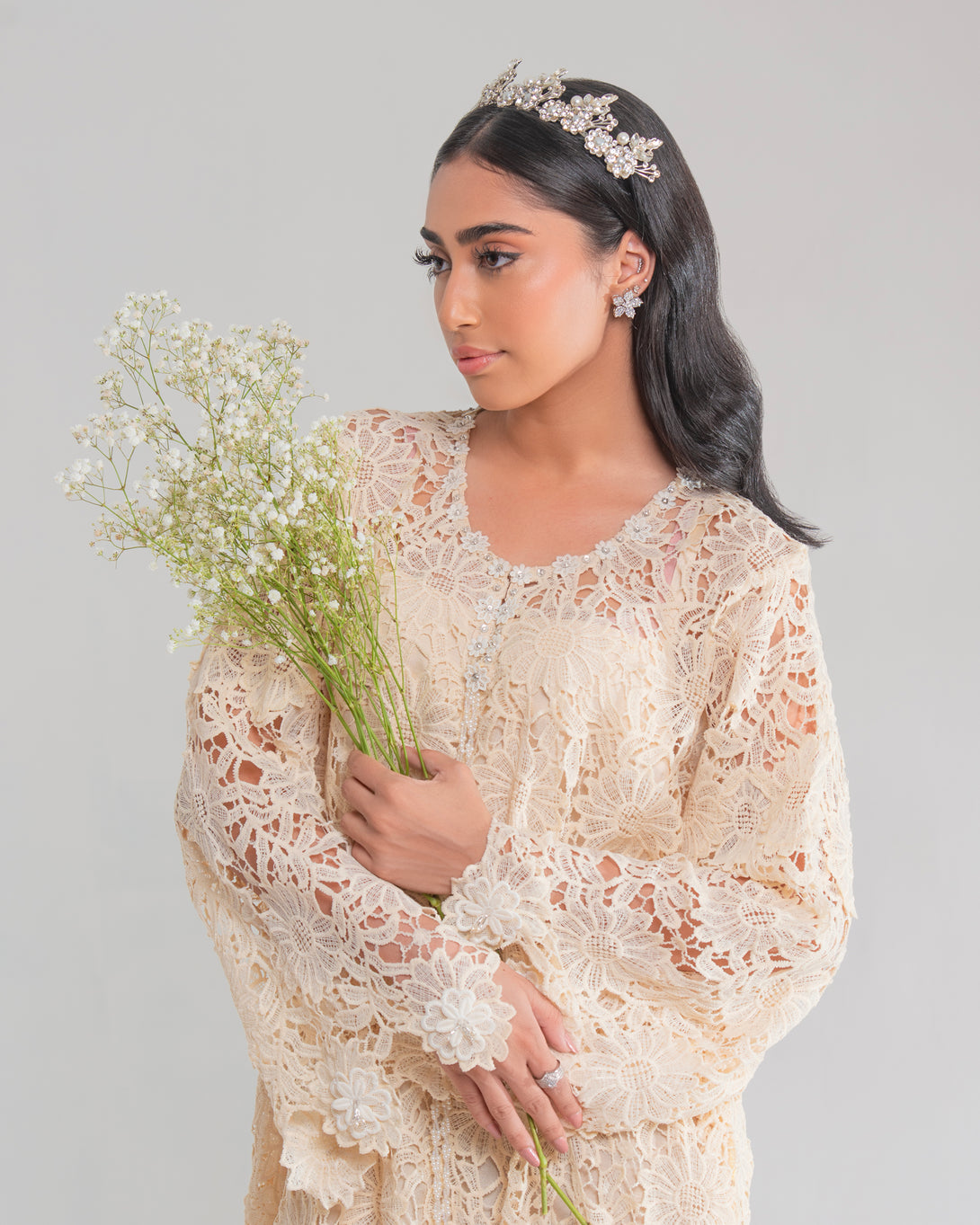 Embellishments: Hand Embellished with Lace Flowers and Silver Stones.