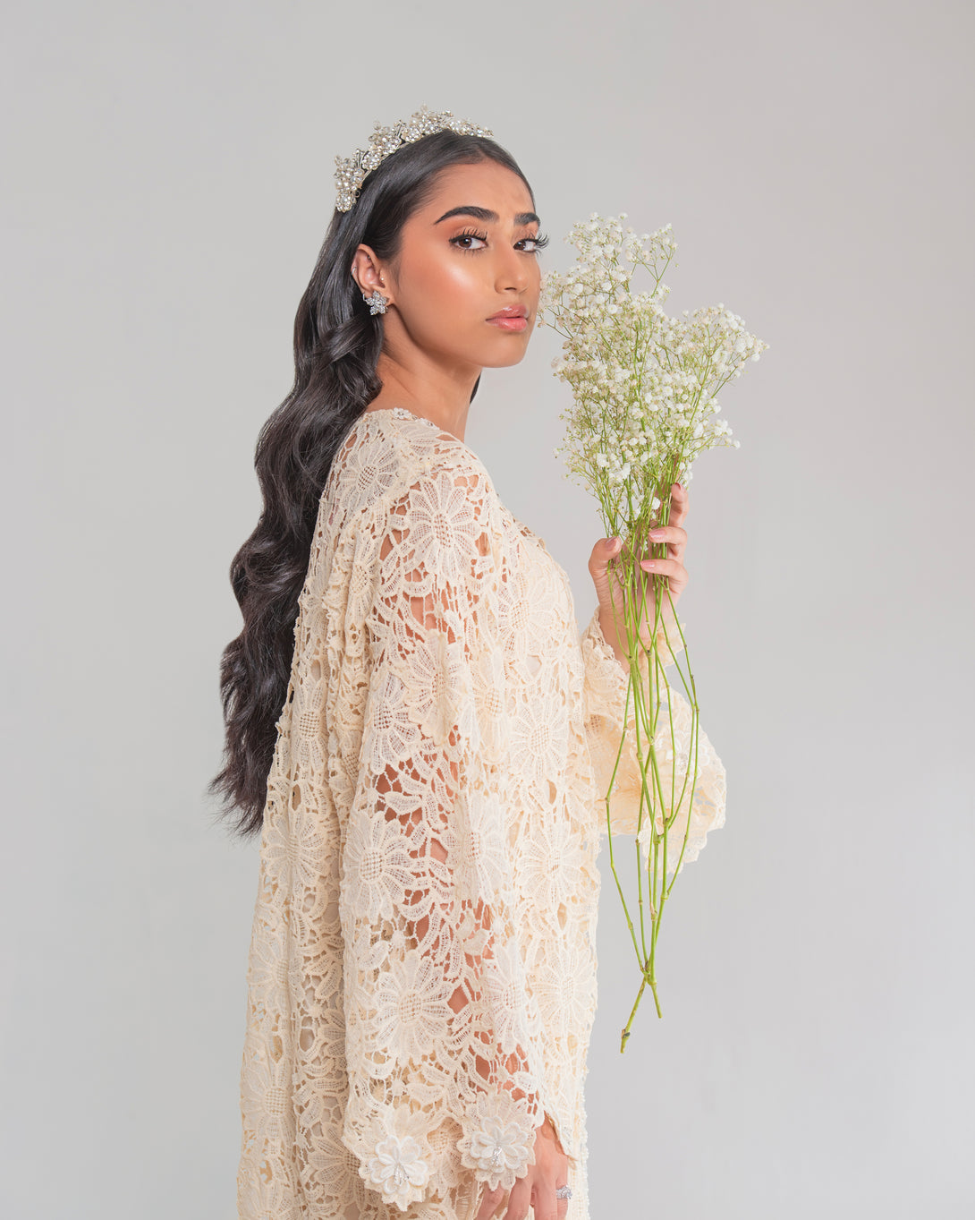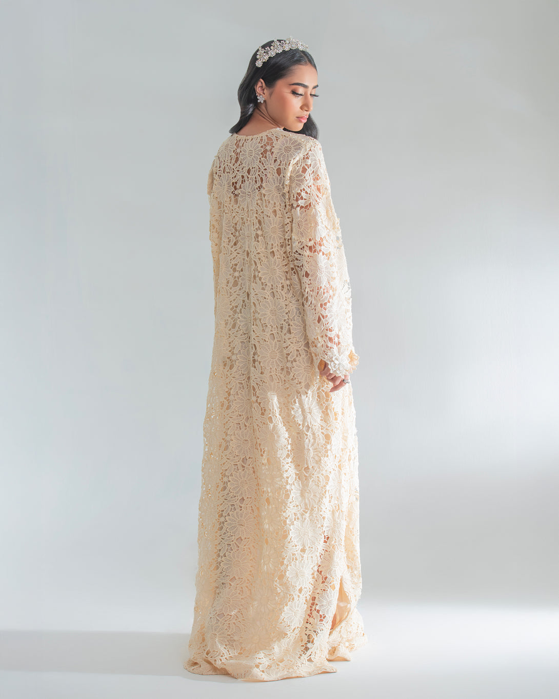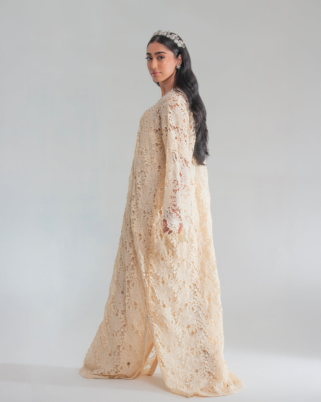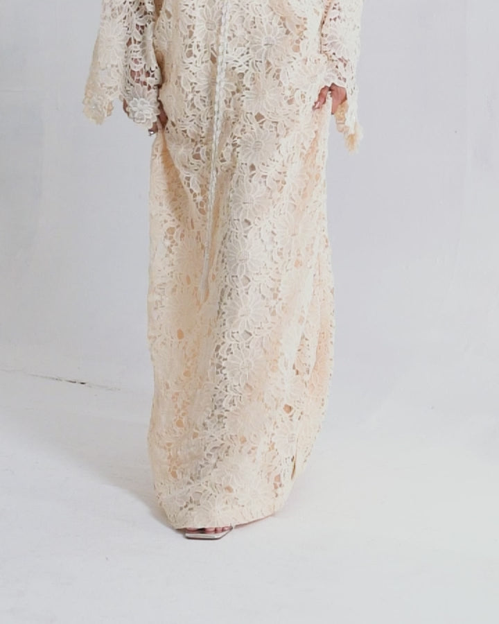 Designed for graceful movement and sophisticated comfort, this cutwork lace kaftan is a versatile addition to any discerning wardrobe. Perfect for formal daytime events, elegant resort wear, sophisticated Eid celebrations, or a luxurious evening out.