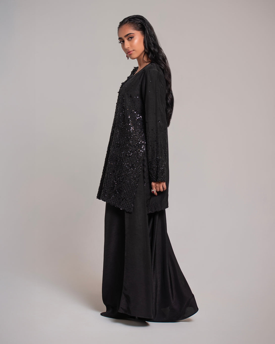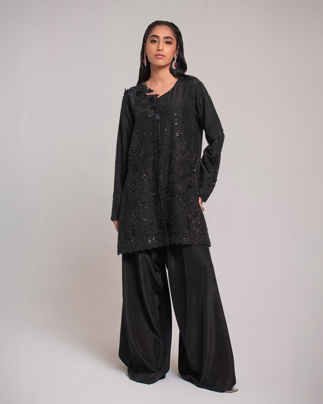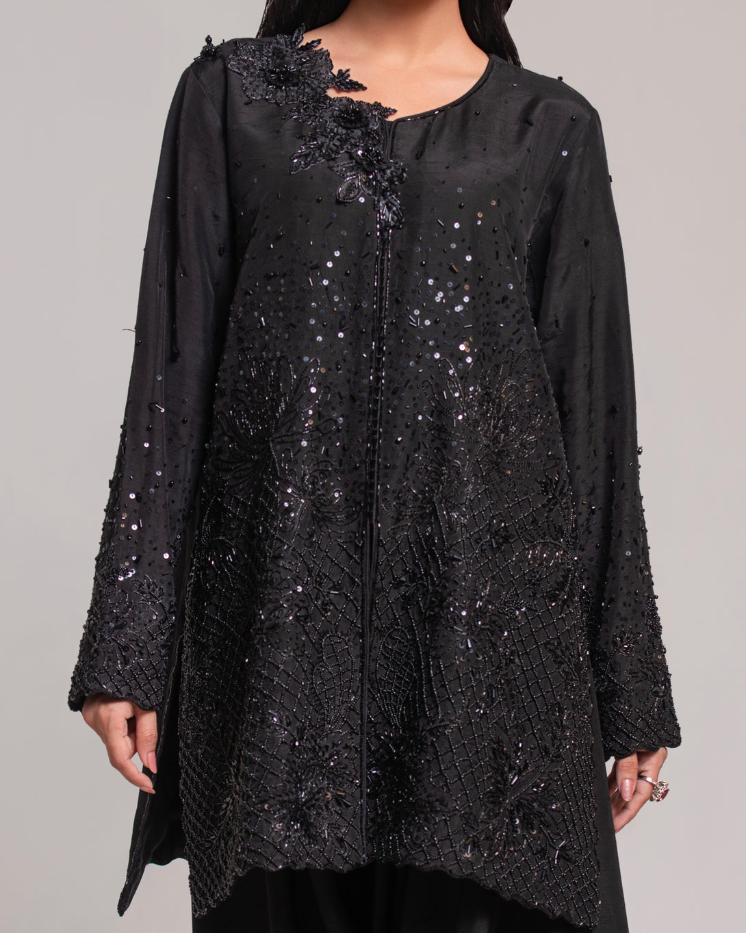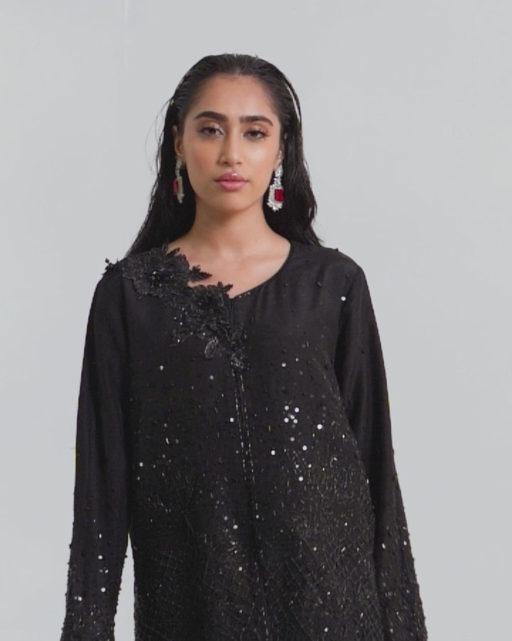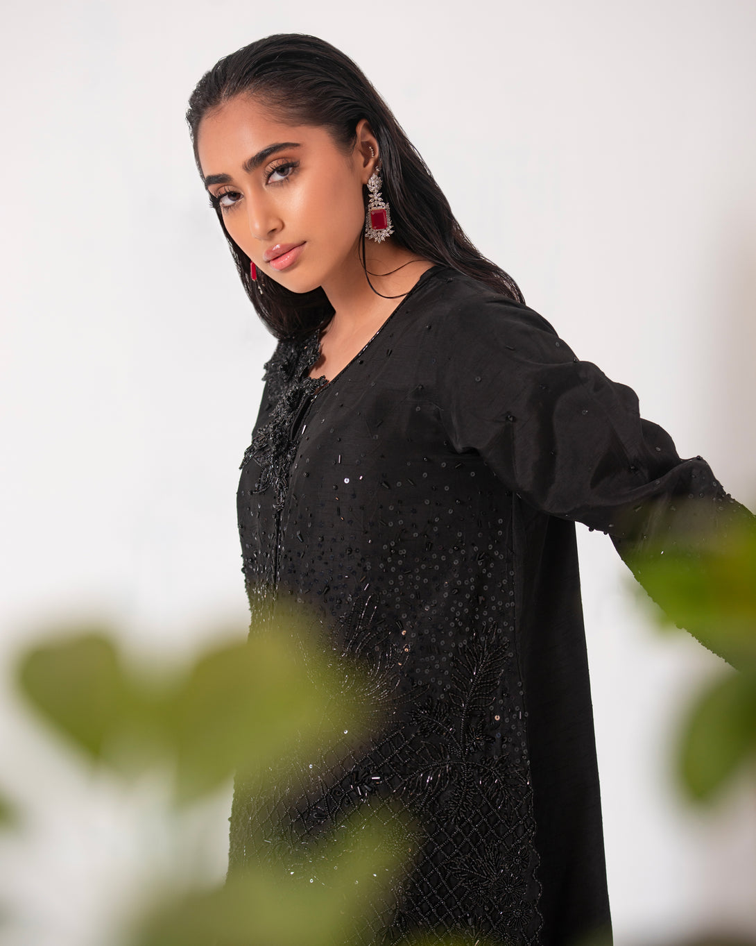 The deep black raw silk is meticulously adorned with intricate hand embroidery, featuring shimmering black sequins, dazzling black crystals, and delicate beads. This tone-on-tone embellishment creates a rich texture and an understated sparkle that catches the light beautifully.