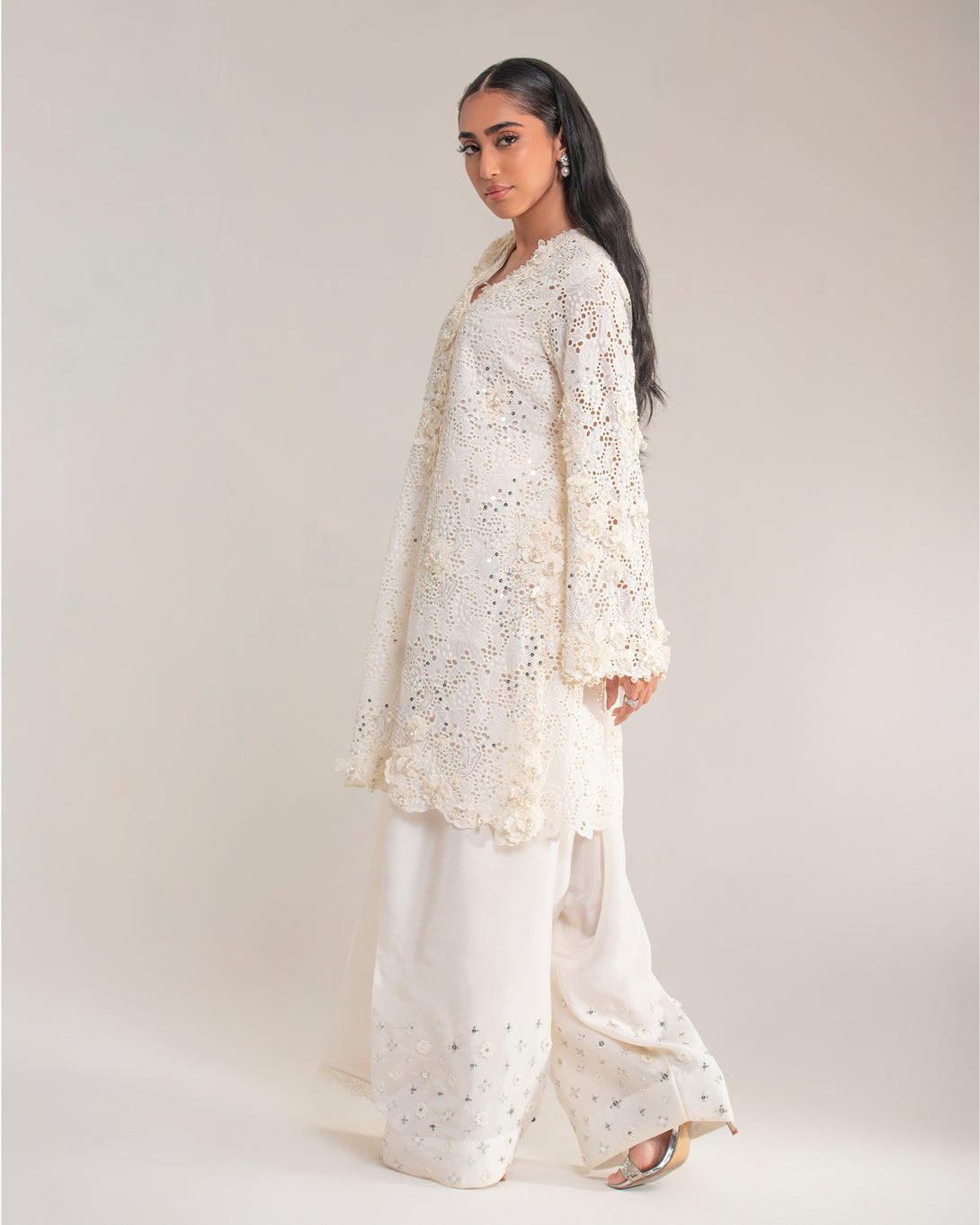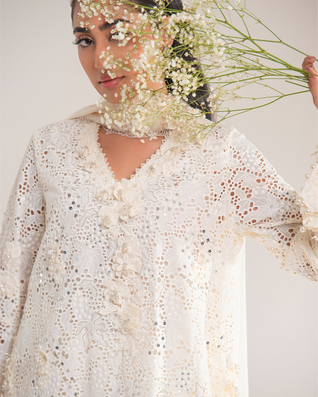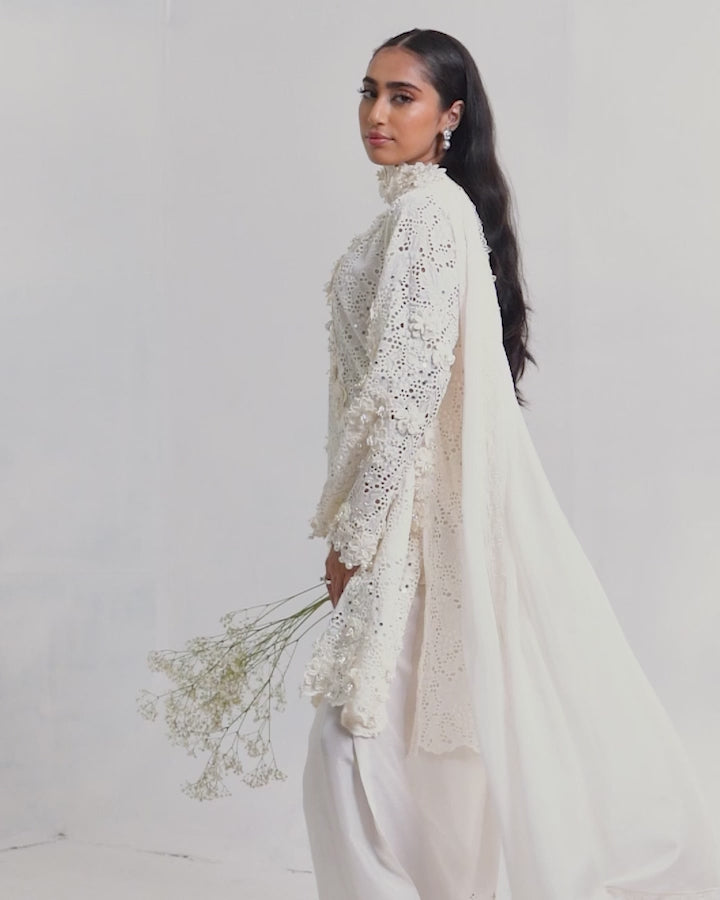 The crisp white schiffli shirt is brought to life with delicate yet deliberate 3D floral embellishments and shimmering silver sequin handwork, accented with subtle stones. It's a testament to intricate craftsmanship and understated luxury.