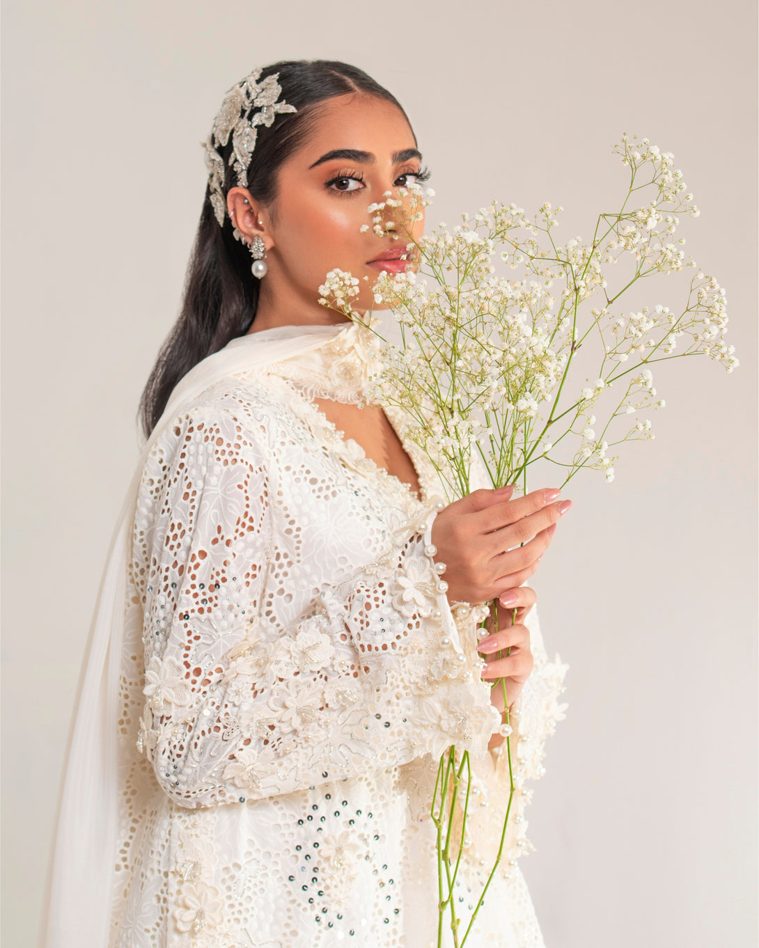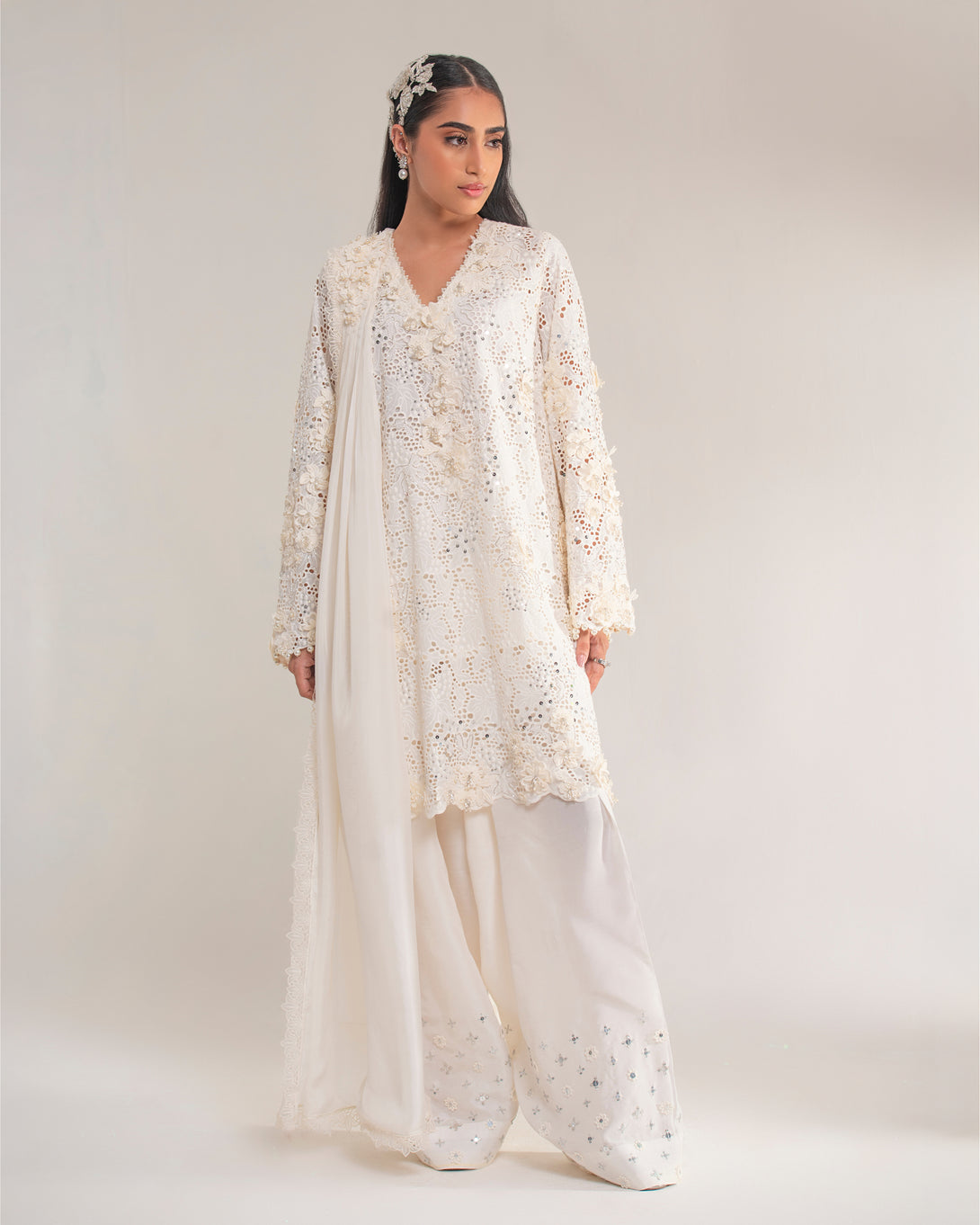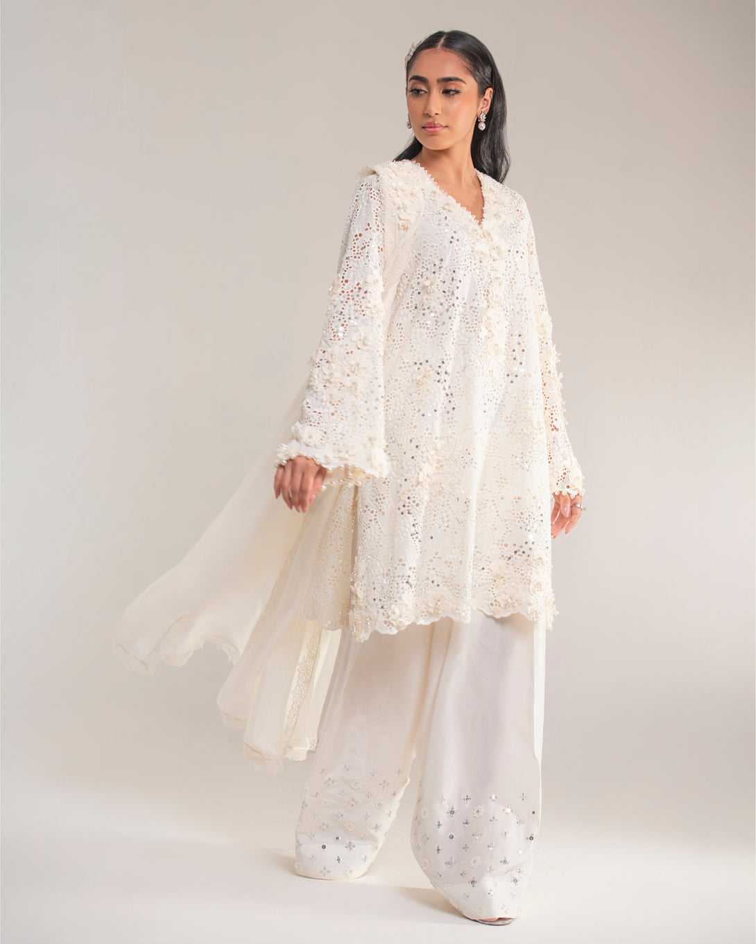 The crisp white schiffli shirt is brought to life with delicate yet deliberate 3D floral embellishments and shimmering silver sequin handwork, accented with subtle stones. It's a testament to intricate craftsmanship and understated luxury.