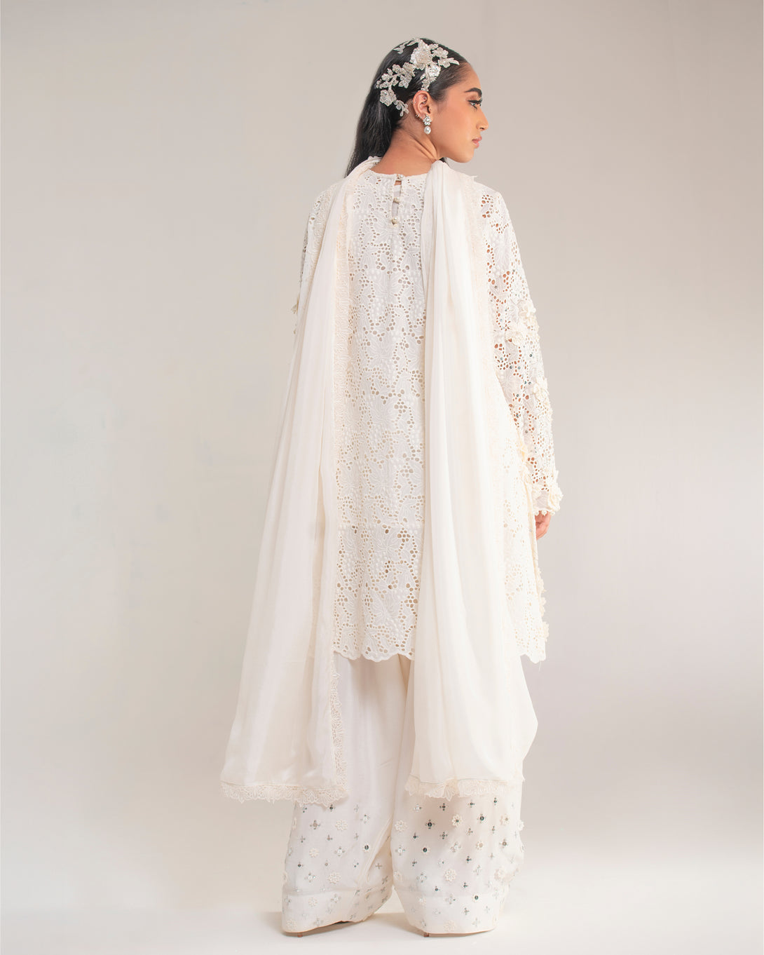 Experience pure, ethereal elegance with our Magnolia White 3-Piece Suit. This exquisitely crafted co-ord set features a stunning white schiffli embroidered shirt, paired with comfortable Korean raw silk pants and a soft medium silk dupatta.