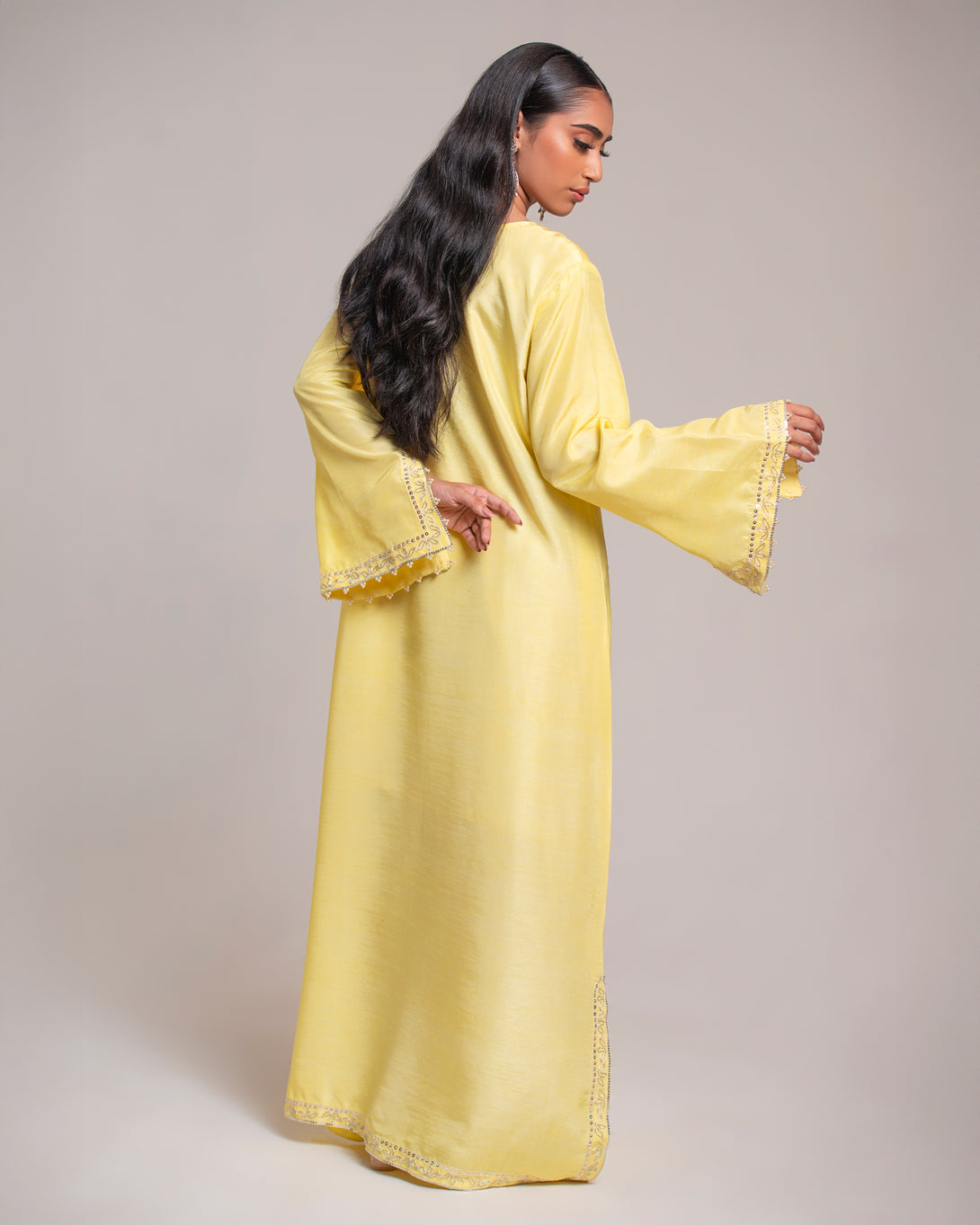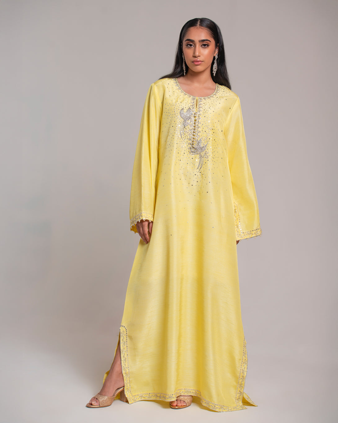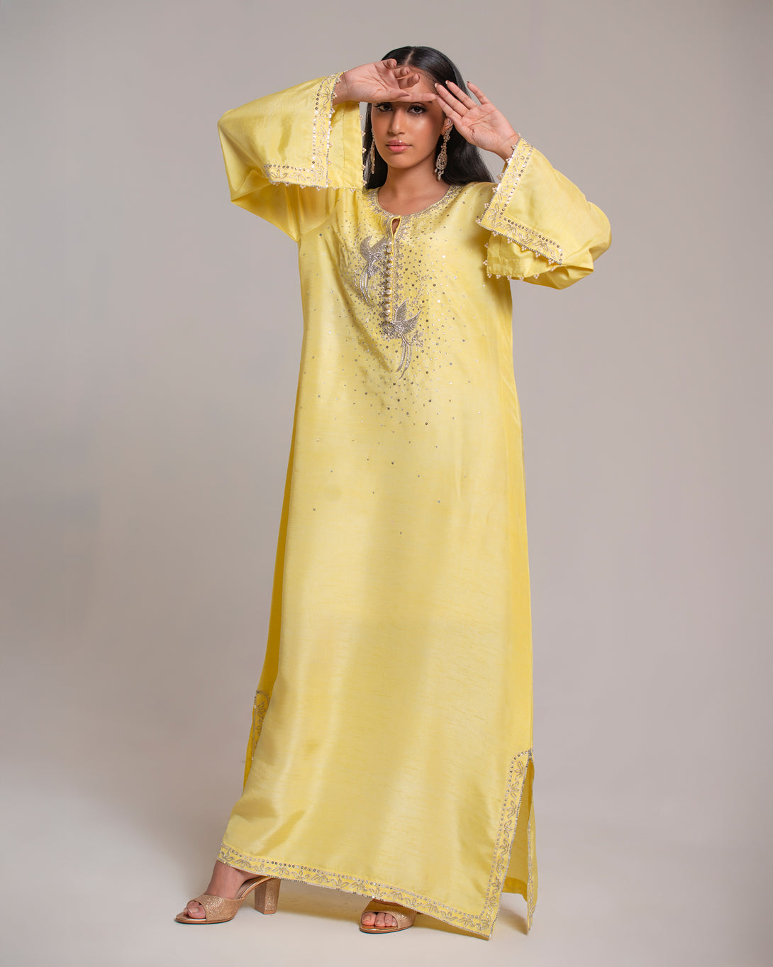 Make a striking statement with our Manila Yellow Kaftan, meticulously hand-embroidered for a truly elegant look. Crafted from luxurious Korean raw silk, this yellow kaftan flows beautifully, offering both comfort and sophistication.