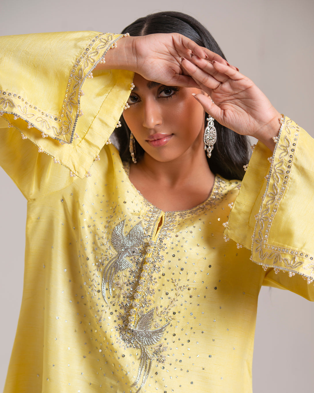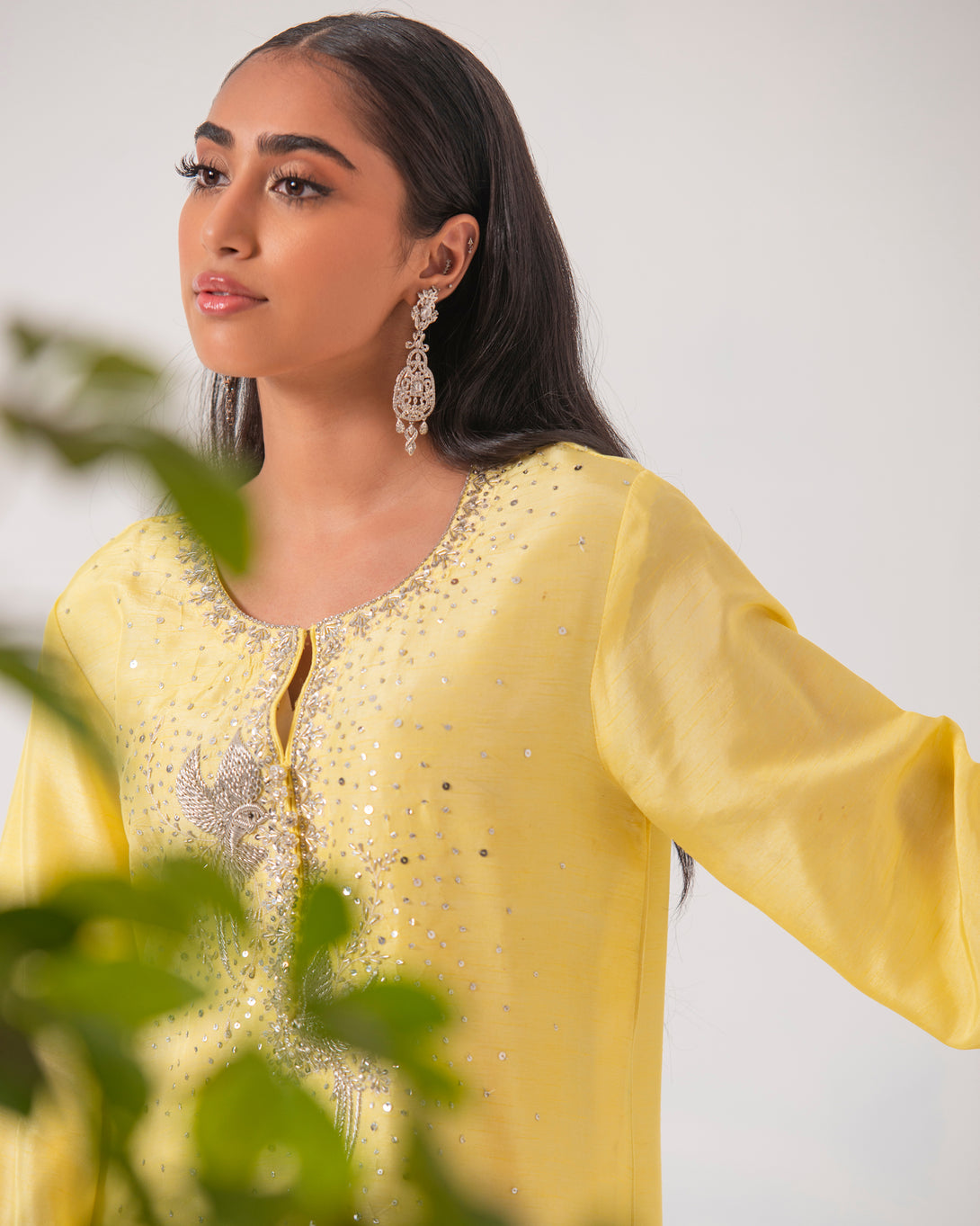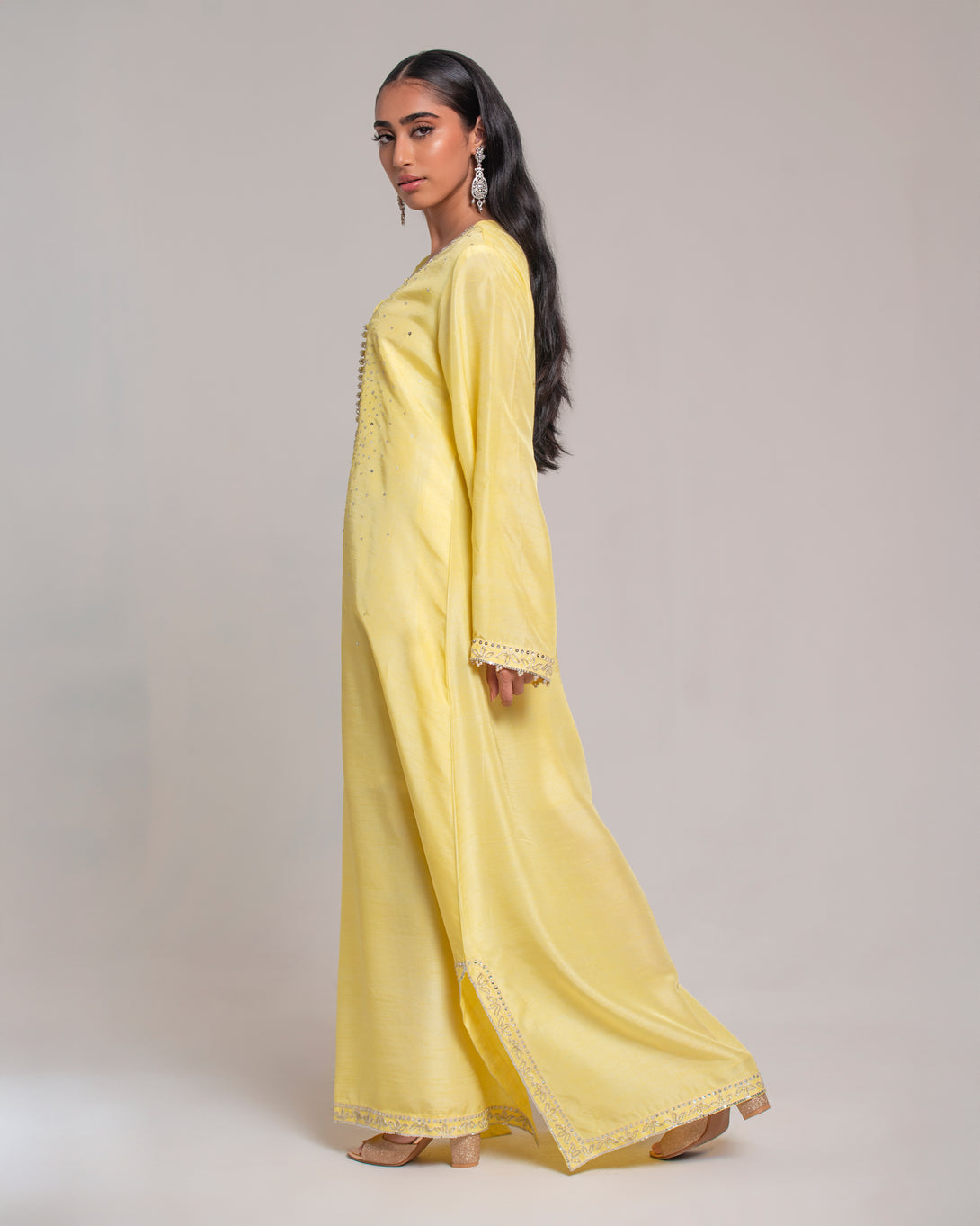 Make a striking statement with our Manila Yellow Kaftan, meticulously hand-embroidered for a truly elegant look. Crafted from luxurious Korean raw silk, this yellow kaftan flows beautifully, offering both comfort and sophistication.