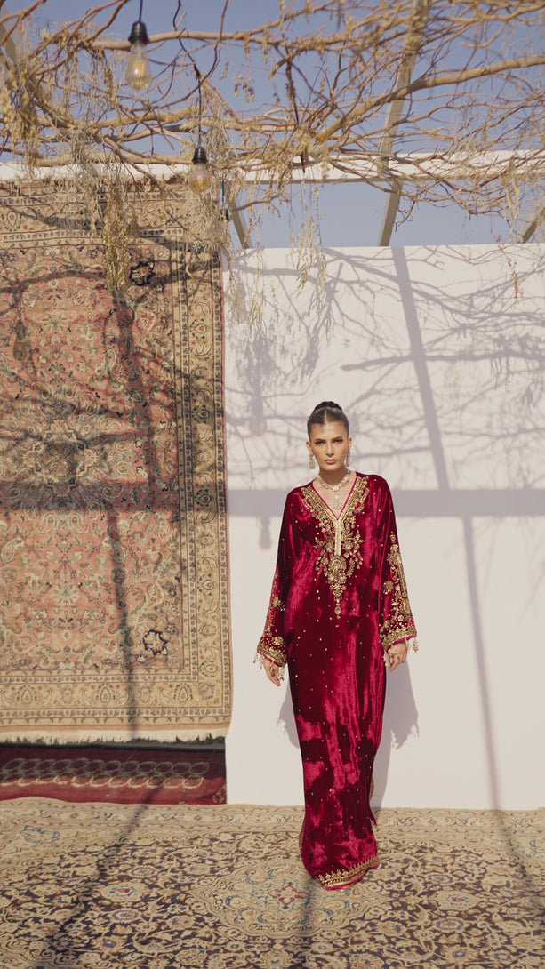 Immerse yourself in royal elegance with this Maroon velvet kaftan, hand-embroidered with gold sequins, dabka, zardozi, and diamond accents. A luxurious festive piece designed to dazzle at every celebration. Handcrafted to perfection, it promises a regal statement for celebrations and special occasions.