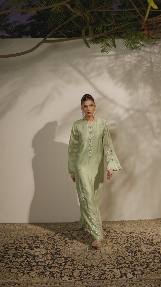 This kaftan is drenched in silver artistry, hand-embroidered with kamdani, nakshi, diamontese, sequins, and delicate pearl finishings. A true statement piece that effortlessly glows from daytime elegance to night-time glamour.