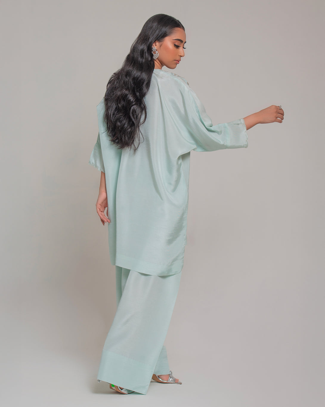 Presenting the Mykonos Light Blue 2-Piece Suit, a beautiful ensemble crafted for understated elegance and comfort. This serene outfit features a relaxed-fit shirt and matching pants, both made from luxurious Korean Raw Silk.