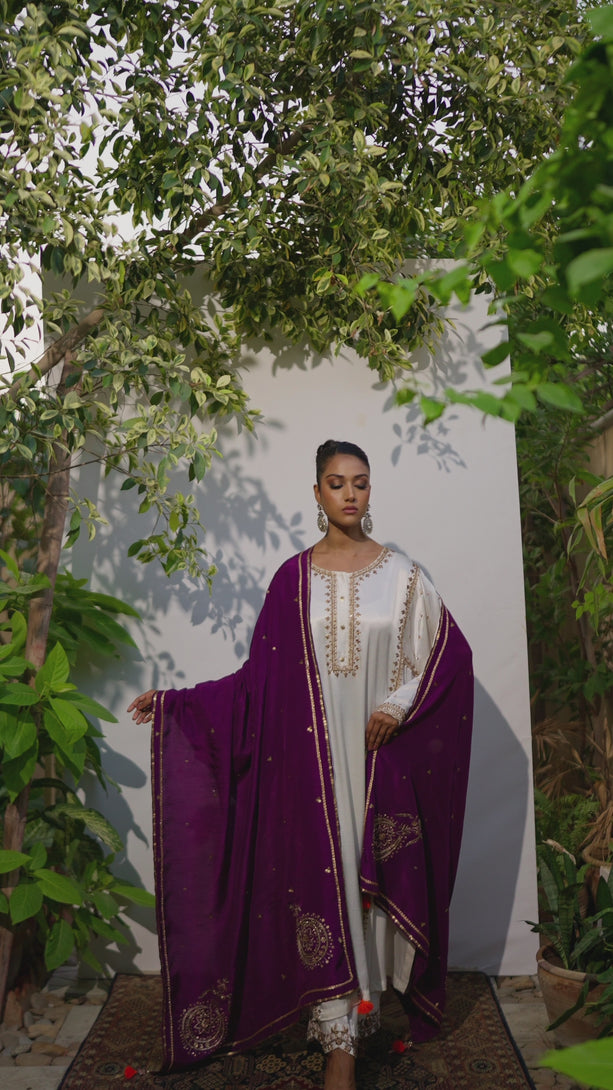 A timeless white ensemble, beautifully hand-worked with gold sequins, marori and dabka. Completed with a contrasting purple dupatta adorned with hand embroidery, it delivers a regal, elevated festive look.