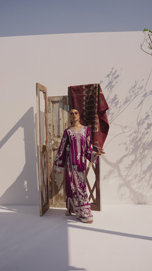 This stunning purple kaftan features off-white resham embroidery inspired by timeless gara artistry, highlighted with silver zari, nakshi, dabka, sequins, and diamontese. A luxurious piece that brings refined, elevated elegance to any occasion.