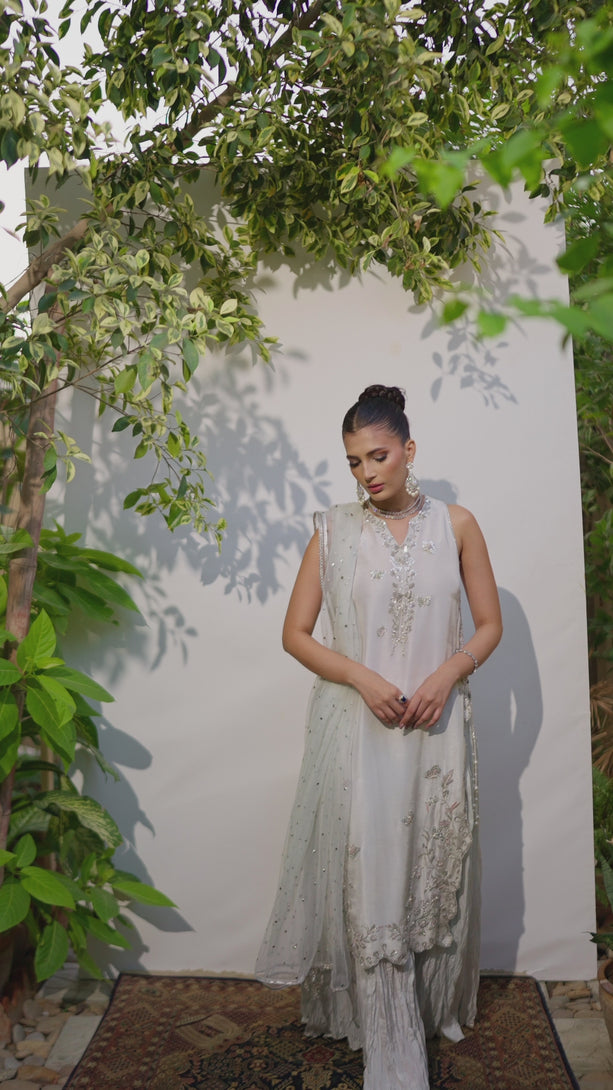 This silver-grey ensemble is exquisitely hand-embroidered with sequins, dabka, nakshi, diamontese, and a delicate touch of resham. Paired with flared crushed pants and a net kamdani dupatta, it stands as a true statement piece, effortlessly elegant for any festive occasion.