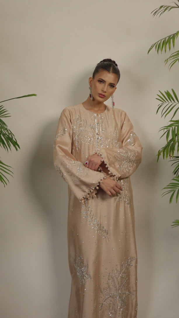 This beige Sheesha raw silk kaftan is delicately hand-embellished with silver cut dana, sequins, and intricate naqshi work, exuding timeless elegance, perfect for any festive celebration.